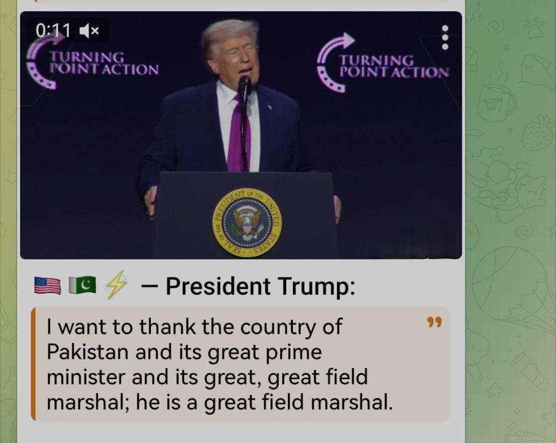 特朗普:我要感谢巴基斯坦这个国家,以及他们伟大的总理和伟大的、伟大的陆军元帅;他是一位了不起的陆军元帅。