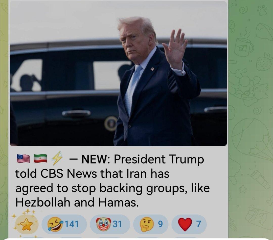 特朗普向CBS新闻等组织表示,伊朗已同意停止支持真主党和哈马斯。