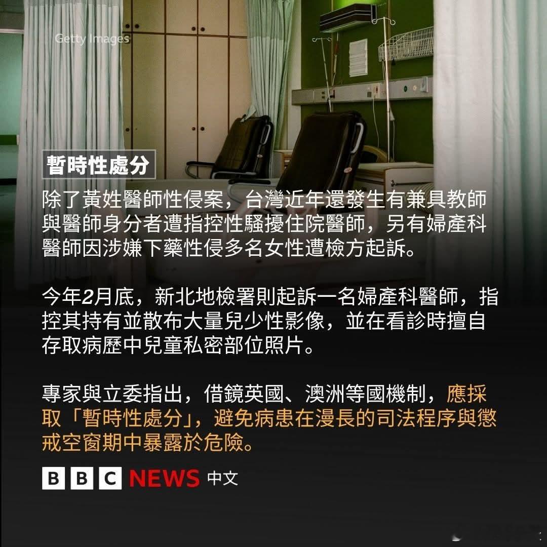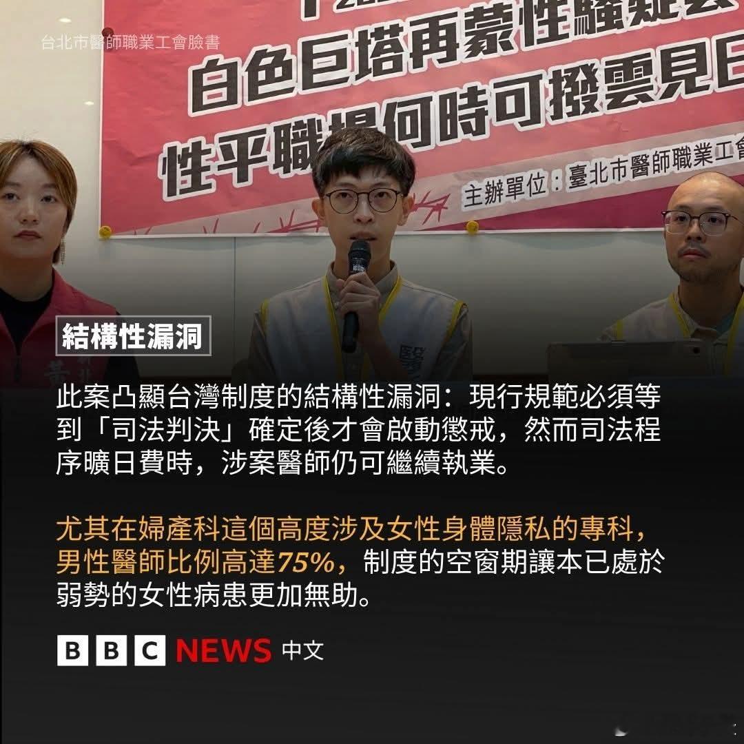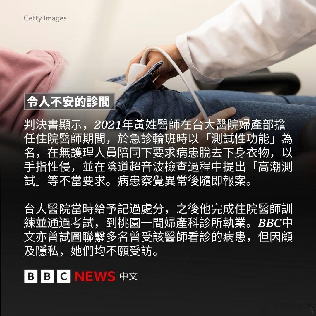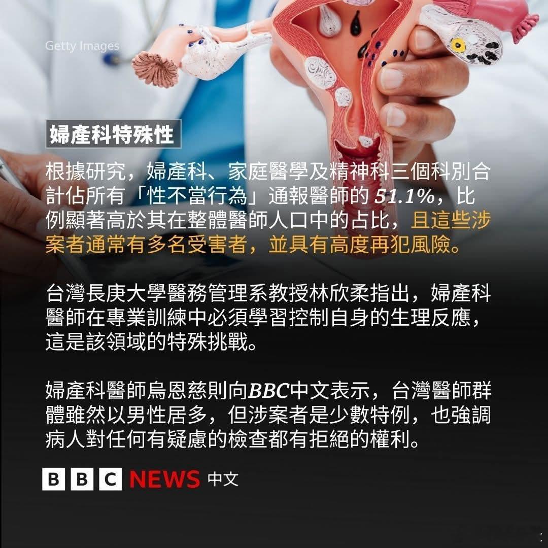 台湾妇科医生性侵病人,受害人报警后依然执业四年BBC报道,2021年黄姓医师在台大医院妇产部担任住院医师期间,于急诊轮班时以「测试性功能」为名,在无护理人员陪同下要求病患脱去下身衣物,以手指性侵,并在阴道超音波检查过程中提出「高潮测试」等不当要求。病患察觉异常后随即报案。2025年5月,案件经法院审理认定其行为构成「对于受照护之人利用机会性交罪」判刑三年。该医师在案件审理期间的四年来持续执业,而地方卫生局与任职诊所均表示事前不知情。这只是公布的其中一起案件,台湾近年曝光多起妇产科医生涉及性罪刑案。桃园市议员黄琼慧表示,她在短短几天内接获超过20名女性陈情,指称该名妇产科医师的过往行为引发疑虑。部分民众在社交平台表示,曾接受该医师的孕前检查并「一直觉得很怪」;也有民众质疑,未来该如何向女儿解释她是由「性侵犯所接生」。此案凸显台湾制度的结构性漏洞:现行规范必须等到「司法判决」确定后才会启动惩戒,然而司法程序旷日费时,涉案医师仍可继续执业。尤其在妇产科这个高度涉及女性身体隐私的专科,男性医师比例高达75%,制度的空窗期让本已处于弱势的女性病患更加无助。台湾最美风景是人日本在马关条约签订日闯入台海