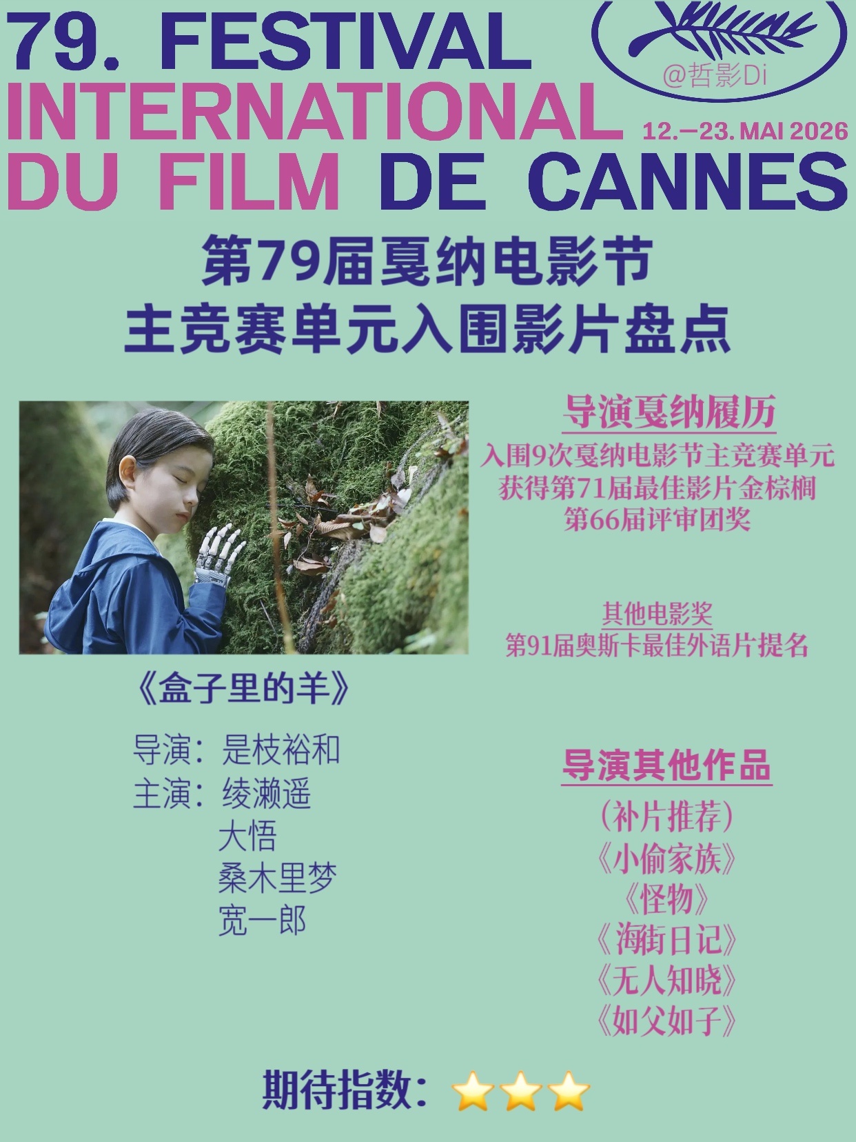 🌿第79届戛纳电影节主竞赛单元入围影片盘点(四)🎬影片:《盒子里的羊》📹导演:是枝裕和🎭主演:绫濑遥、大悟、桑木里梦、宽一郎、中岛步等🎞️补片推荐:《小偷家族》《怪物》《海街日记》《无人知晓》《如父如子》