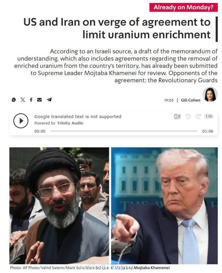 4、以色列国家广播公司Kan11频道称,伊朗和美国即将签署谅解备忘录,关于限制铀浓缩与移交部分铀库存的提案已被移交给小哈梅内伊审议,该提案得到总统佩泽什基安与外交部长阿拉格奇的支持,但受到革命卫队和国家安全委员会的反对。