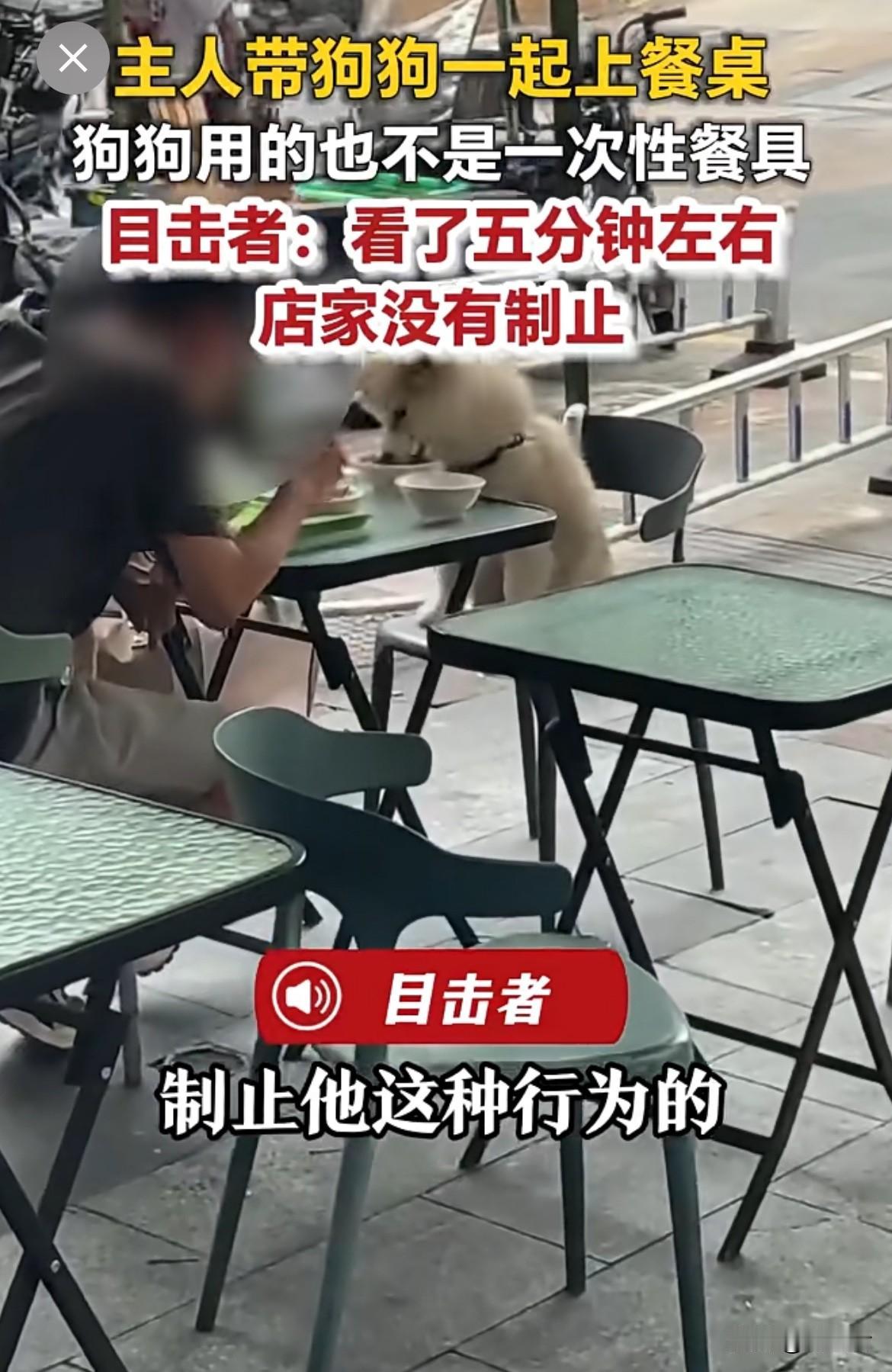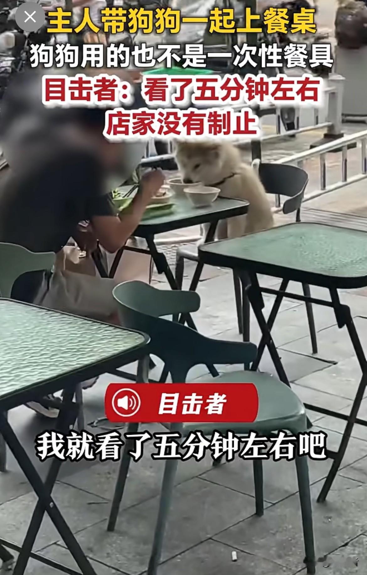 让狗直接用饭店公共餐具进食。目击者看了五分钟,店家也没制止。这事儿发生后,饭店说