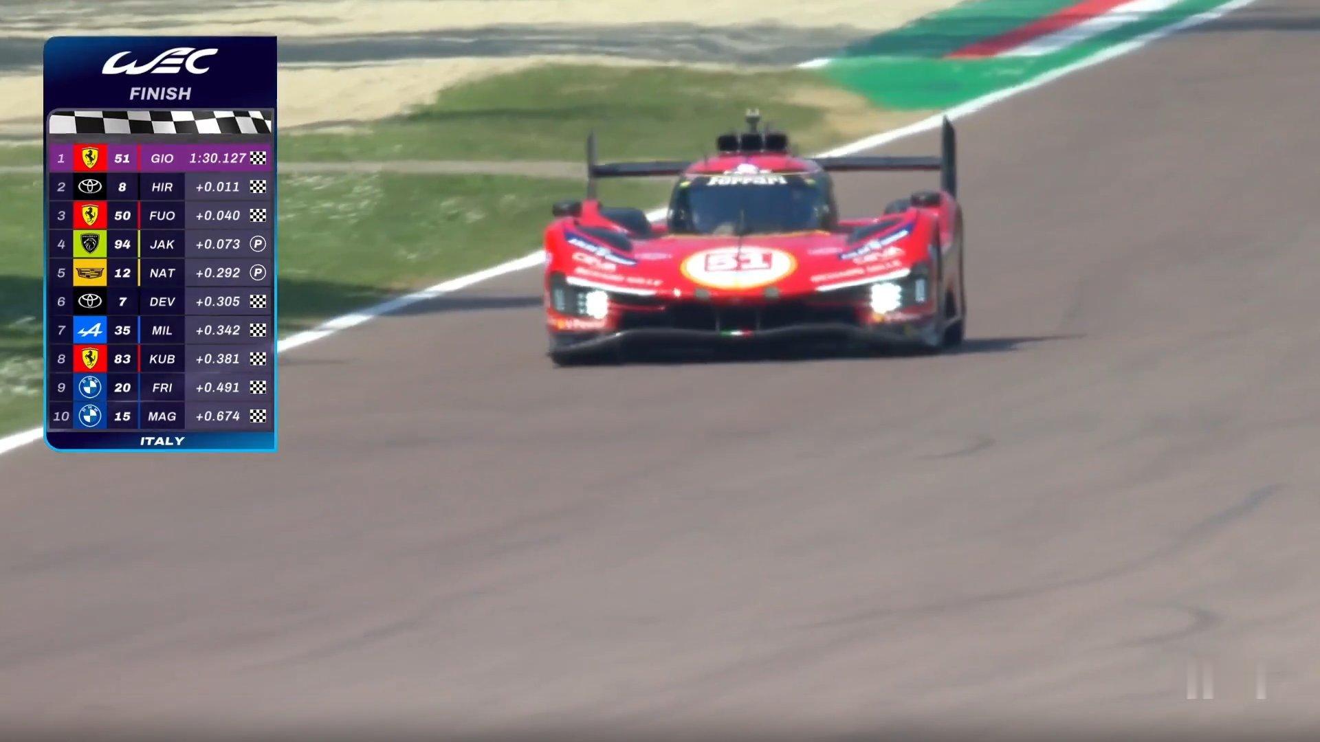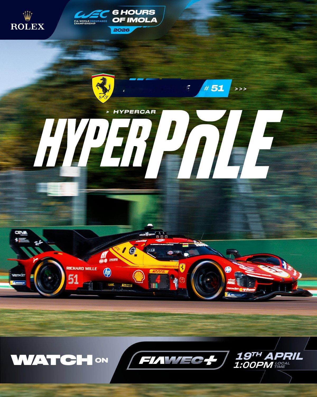 “东边不亮 西边又亮诶” WEC伊莫拉6小时耐力赛-超级杆位赛,法拉利AF Corse的51号车组(由车手吉奥维纳兹驾驶)最终以1:30.127夺得Hypercar组别杆位!WEC赛车法拉利伊莫拉6小时耐力赛