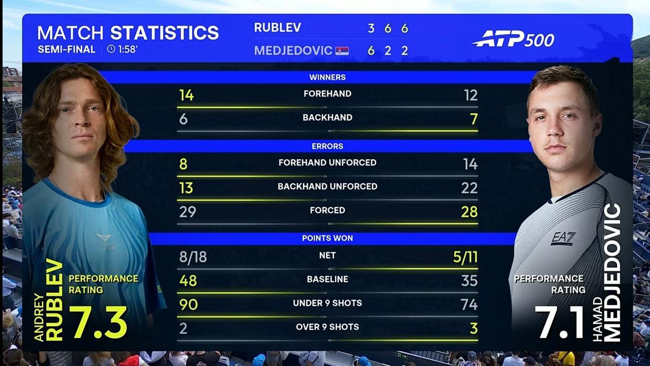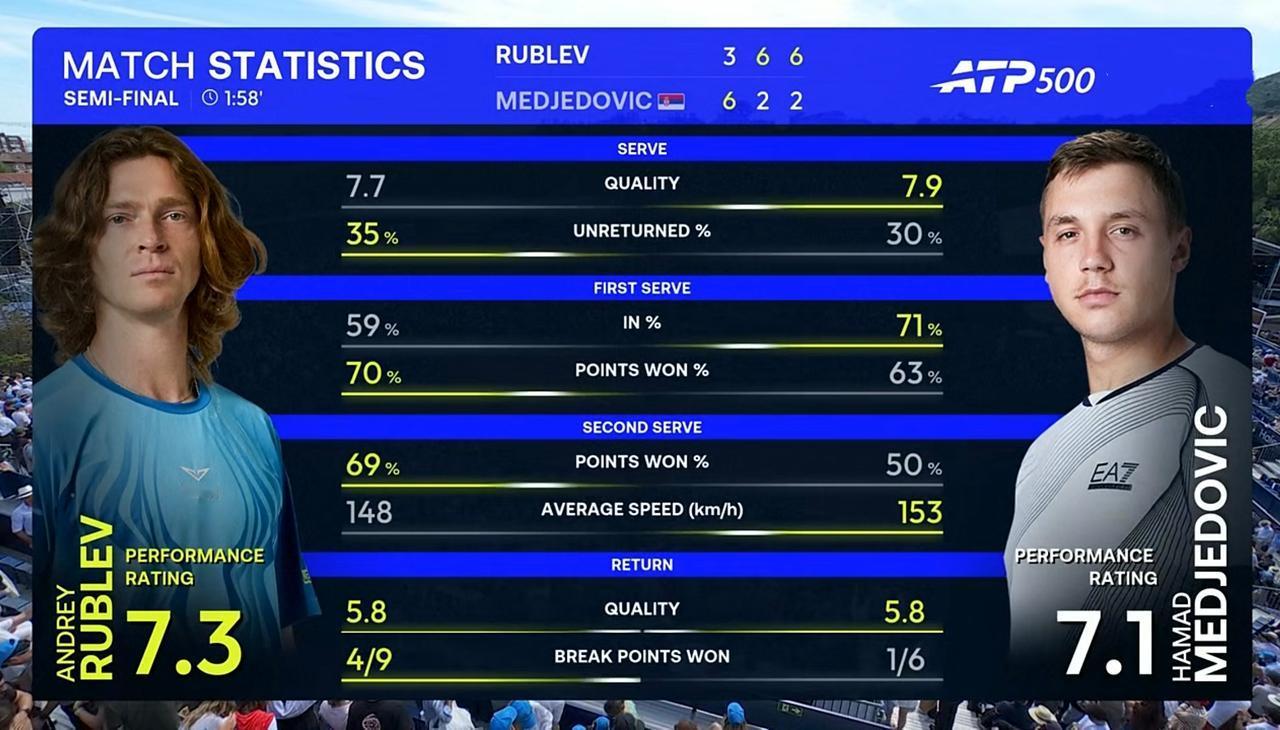 整场比赛,卢布列夫共轰出5记ACE,比对手少1记;发出2个双误,比对手少1个;一发得分率68.63%,比对手高出6个多百分点;二发得分率68.75%,比对手高出18个多百分点;共拿到9个破发点,比对手多3个;成功破发4次,比对手多3次;总得分94分,比对手多15分。