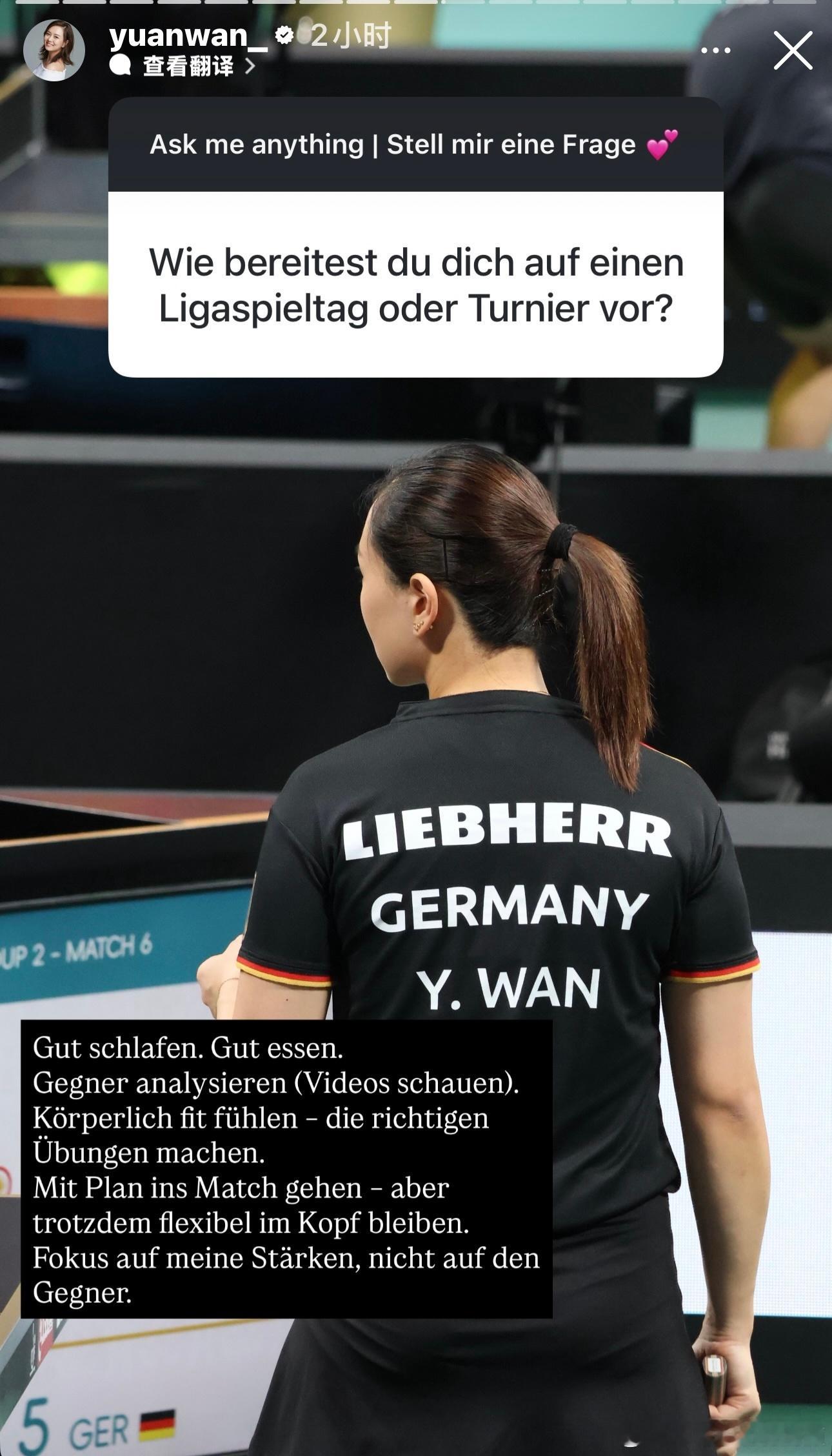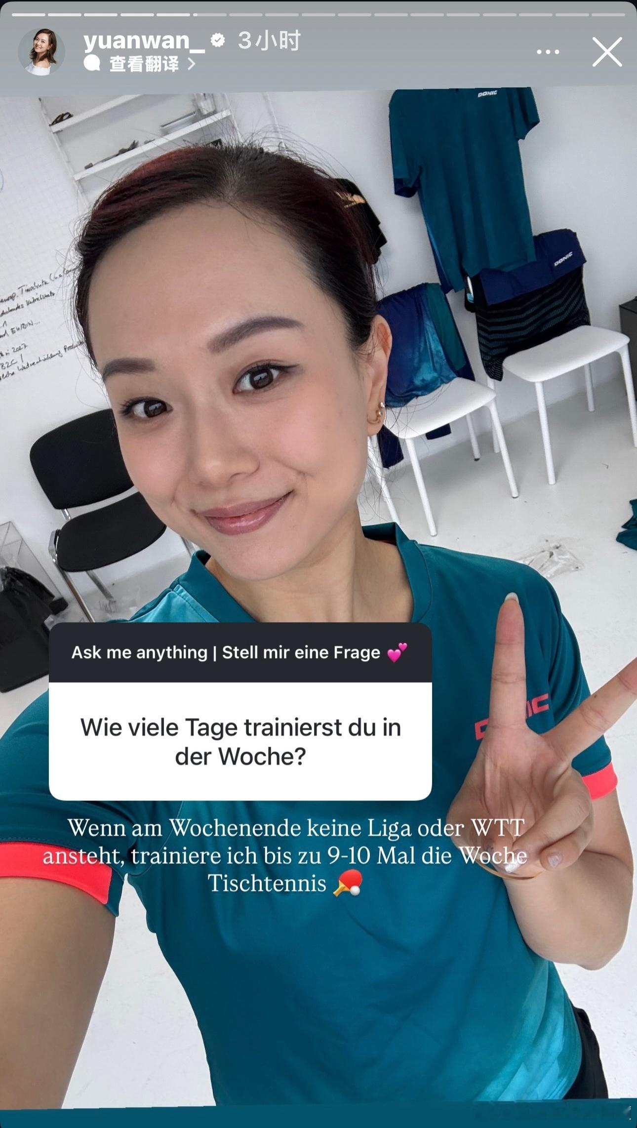 Q4:你一周训练几天?A:如果周末没有联赛或WTT(世界乒乓球职业大联盟)赛事,我每周最多会训练9到10次乒乓球。