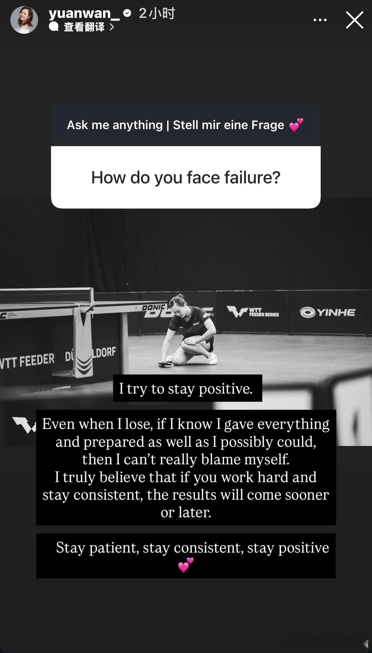 Q5:你如何面对失败?A:我尽量保持积极。即使输了,如果我知道自己已经全力以赴、做了尽可能充分的准备,那我就不会真的责怪自己。我坚信,只要你努力并保持坚持,结果迟早会到来。保持耐心,保持坚持,保持积极。