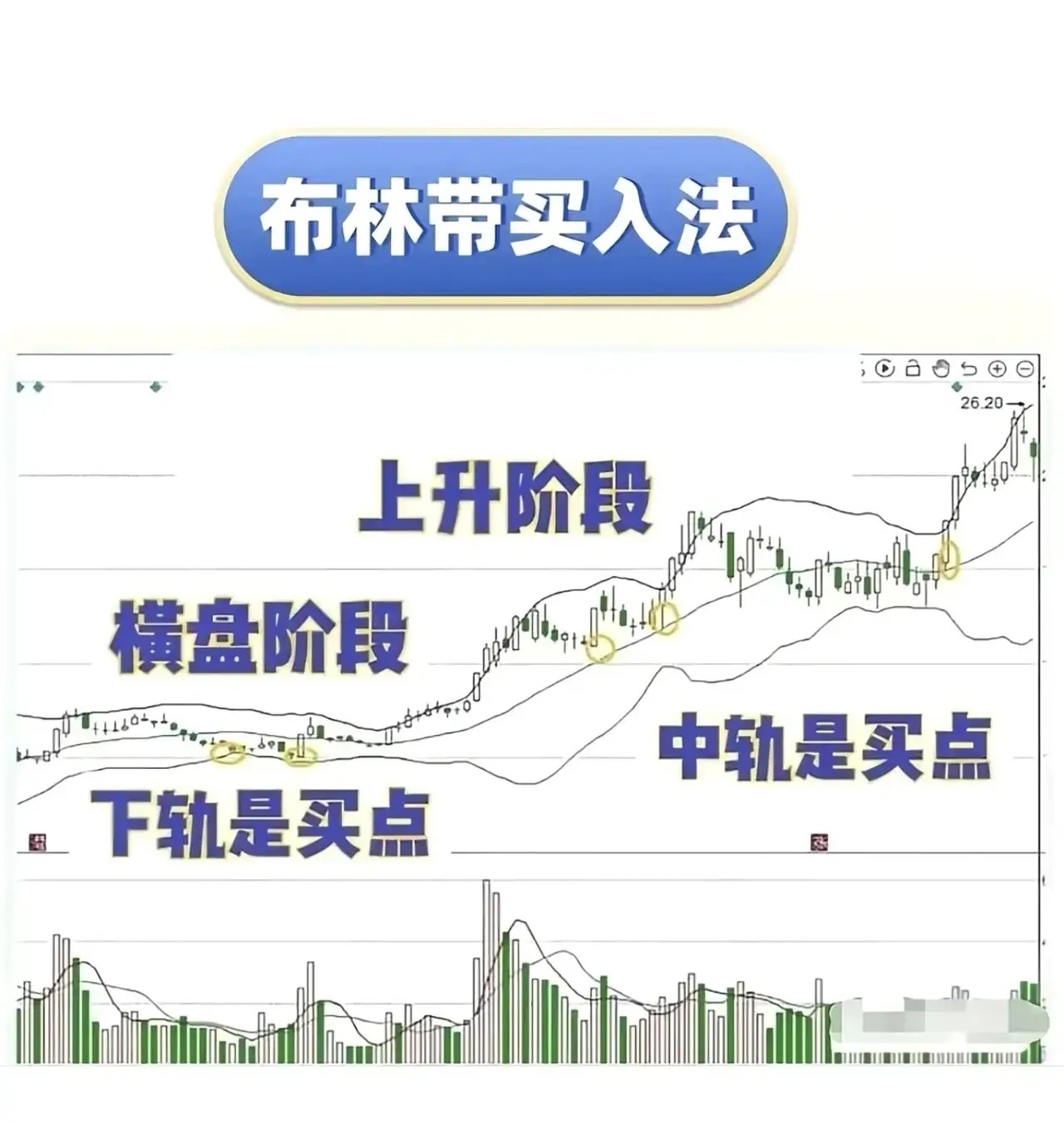 核心逻辑:布林带由中轨(MA20)、上轨、下轨构成,股价触及下轨后反弹,或在中轨附近企稳,常对应超跌修复或趋势延续。