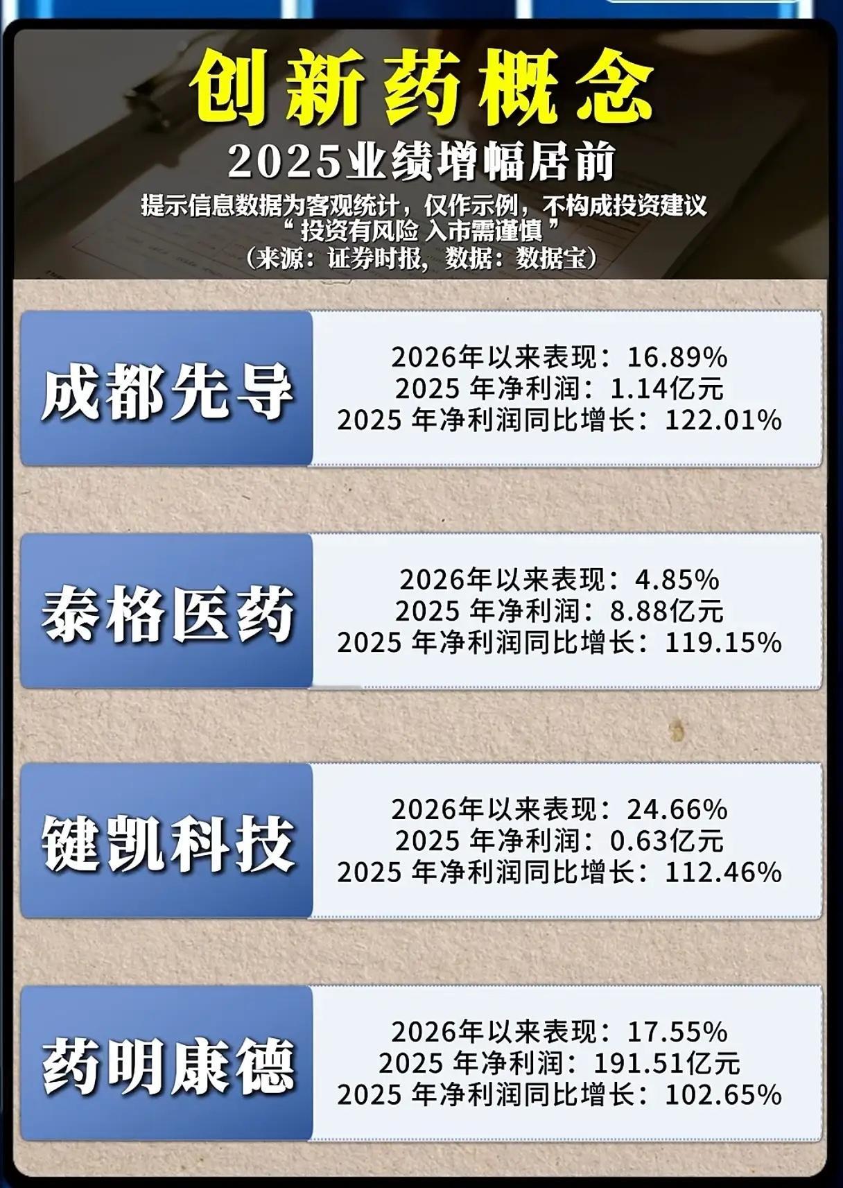 业绩翻倍、政策暖风频吹!创新药的“黄金时代”真的来了?2026年的创新药赛道,正在上演一场属于“长期主义者”的逆袭。从数据宝和证券时报统计的这份业绩榜单来看,16家创新药概念公司在2025年交出了净利润同比增幅超100%的亮眼答卷,其中上海谊众、北陆药业的增速更是突破500%,用实打实的业绩打破了市场对创新药“高投入低回报”的刻板印象。这些企业的爆发并非偶然。2026年4月国务院办公厅发布的《关于健全药品价格形成机制的若干意见》,为创新药行业吹来了久违的政策暖风——明确支持高水平创新药制定与高投入、高风险相符的价格,并享有5-7年的价格稳定期,这意味着“创新不集采”的时代正在加速到来。政策的松绑,让企业的研发投入终于能获得合理回报,三生国健28.99亿元的净利润、药明康德超190亿的利润规模,正是行业价值兑现的缩影。更值得关注的是,AI制药技术的成熟正在重塑行业的底层逻辑。2026年,AI制药从概念走向商业化落地,研发周期从传统的10-12年压缩至5-7年,成本降低超50%,这让中小创新药企也有了参与全球竞争的底气。比如榜单中的键凯科技、上海谊众,正是凭借技术迭代实现了业绩与股价的双向增长,前者2026年以来股价涨幅超24%,后者涨幅也接近20%。当然,行业分化也在加剧。尽管多数企业业绩翻倍,但仍有太极集团、康辰药业等个股今年以来股价出现回调,这也提醒投资者,创新药赛道早已告别“普涨时代”,真正能穿越周期的,是那些手握核心技术、拥有商业化能力的企业。从政策暖风到技术突破,再到业绩兑现,创新药行业正在迎来一次全面的价值重估。那些熬过寒冬、坚持研发的企业,正在用翻倍的业绩证明,中国创新药的黄金时代,或许才刚刚开始。