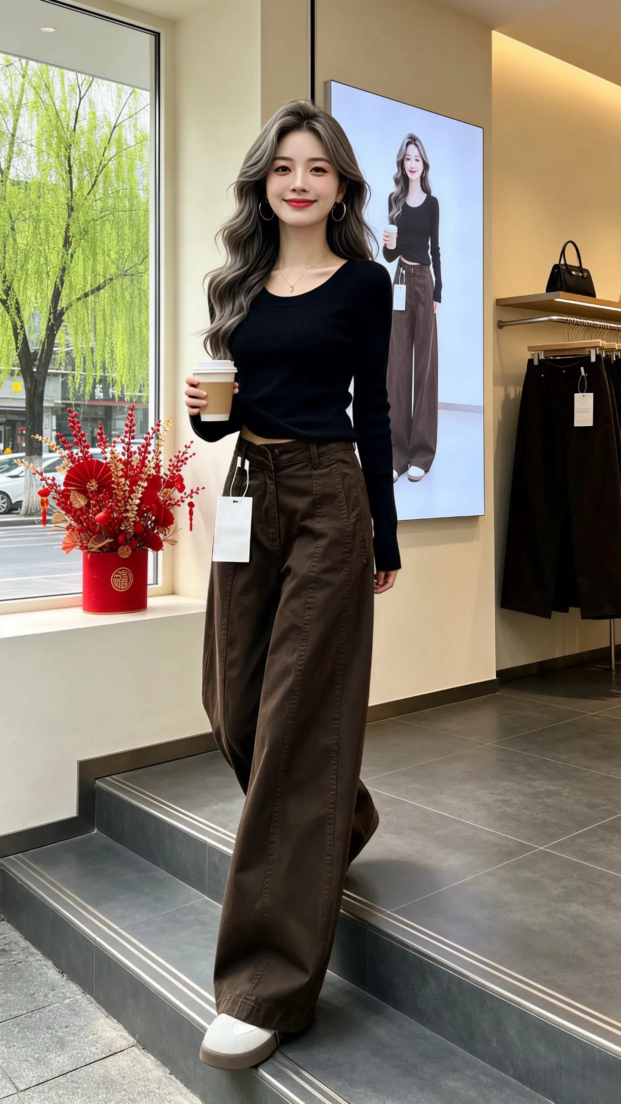 回头率超高的时髦老钱风!这组大地色系穿搭太绝了,浅咖针织Polo衫搭配藏青阔腿