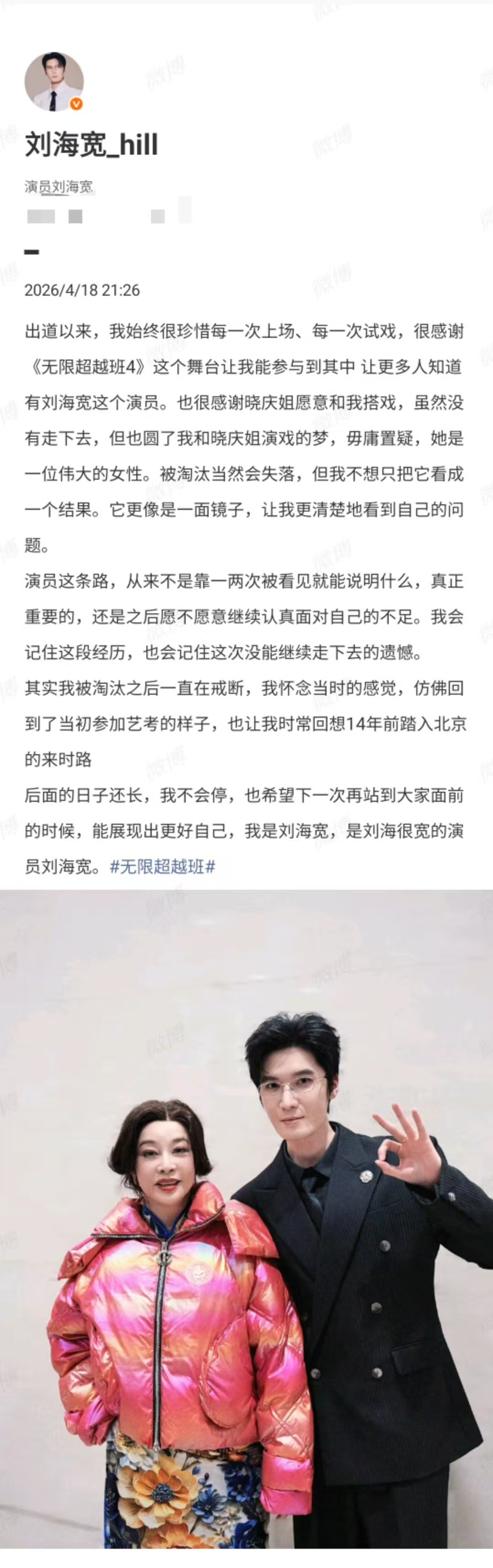 刘晓庆没选刘海宽刘海宽淘汰 虽然没能被选入战队,但刘海宽求演女友的绝对赢了!从被吐槽“孙子找奶奶算账”到发文感谢“伟大的女性”,这心态调整速度也是没谁了,正如他所说机会总会来的,这次的翻车也许就是下一次成功的铺垫