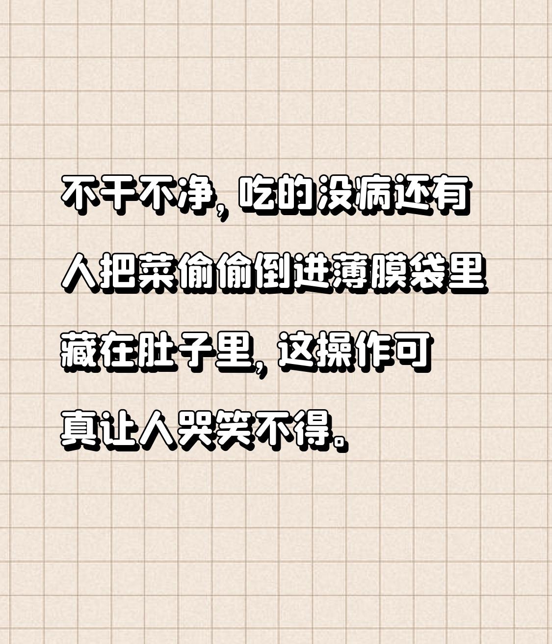 我就见过有人吃饭时那“不干不净”的操作。之前在食堂,有个大哥吃饭时,把吃不完的菜偷偷倒进薄膜袋里,然后塞到衣服里。当时我都看呆了,这是怕浪费,还是想带回去加餐啊?虽说“不干不净,吃了没病”,但这种藏菜的行为也太奇葩了。也不知道他回去打算怎么处理这些菜,难道是留着下顿接着吃?想想都觉得搞笑。不过话说回来,节约粮食是好事,但也得注意方式方法,不然这一顿操作下来,真让人忍不住笑。