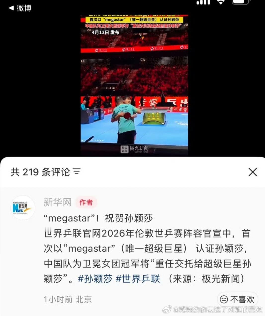 过去好几天了硬是红V和站子都不敢发孙颖莎是Megastar,最后想出来这么一招,孙颖莎的成就在莎头粉眼中是一根刺,看到唯一超级巨星六个字了么