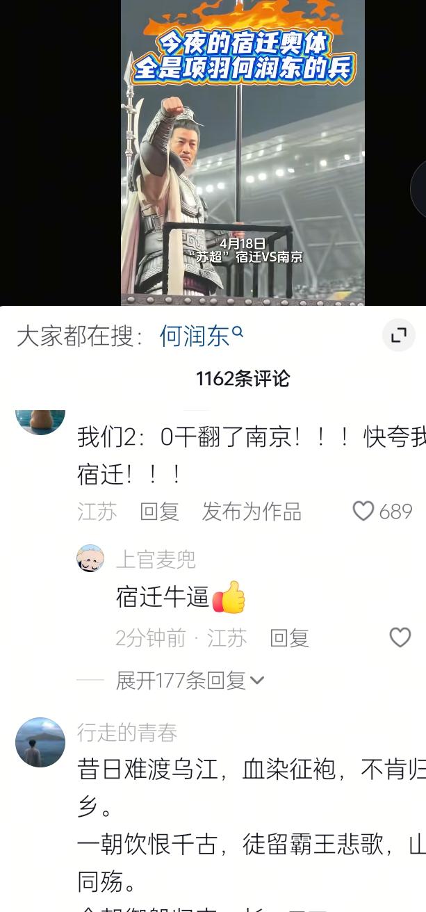 今晚苏超宿迁队对阵南京队,之前有很多人都凭感觉猜测宿迁0:2南京,或者1:2南京,亦或是0:3南京,但是,让很多人万万没想到的是宿迁2:0南京,终于报了去年之仇,去年宿迁0:4南京队,就在今晚终于“报仇”了!评论区很多人都在为宿迁干翻南京而欢呼,今天宿迁就是江苏“省会”,今天宿迁“过年”了,去年很多球队都真的是草根球队,今年很多球队队员都换了,所以在没踢之前存在的变数很多,几乎没人能想到宿迁在四分多钟就进球了,随后点球进球了,今晚苏超荣耀属于宿迁!加油吧!