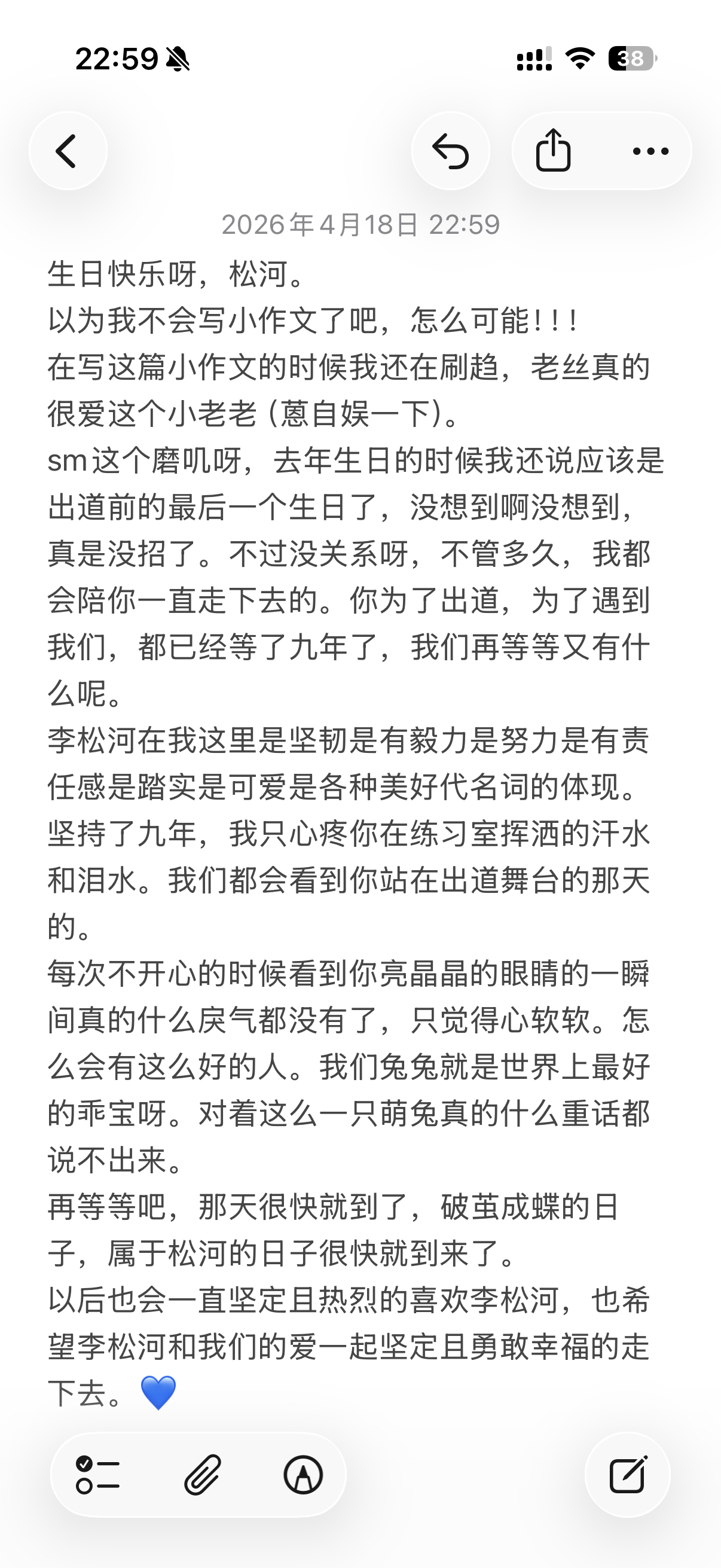 生日快乐呀,松河。以为我不会写小作文了吧,怎么可能!!!在写这篇小作文的时候我还在刷趋,老丝真的很爱这个小老老(蒽自娱一下)。sm这个磨叽呀,去年生日的时候我还说应该是出道前的最后一个生日了,没想到啊没想到,真是没招了。不过没关系呀,不管多久,我都会陪你一直走下去的。你为了出道,为了遇到我们,都已经等了九年了,我们再等等又有什么呢。李松河在我这里是坚韧是有毅力是努力是有责任感是踏实是可爱是各种美好代名词的体现。坚持了九年,我只心疼你在练习室挥洒的汗水和泪水。我们都会看到你站在出道舞台的那天的。每次不开心的时候看到你亮晶晶的眼睛的一瞬间真的什么戾气都没有了,只觉得心软软。怎么会有这么好的人。我们兔兔就是世界上最好的乖宝呀。对着这么一只萌兔真的什么重话都说不出来。再等等吧,那天很快就到了,破茧成蝶的日子,属于松河的日子很快就到来了。以后也会一直坚定且热烈的喜欢李松河,也希望李松河和我们的爱一起坚定且勇敢幸福的走下去。💙
