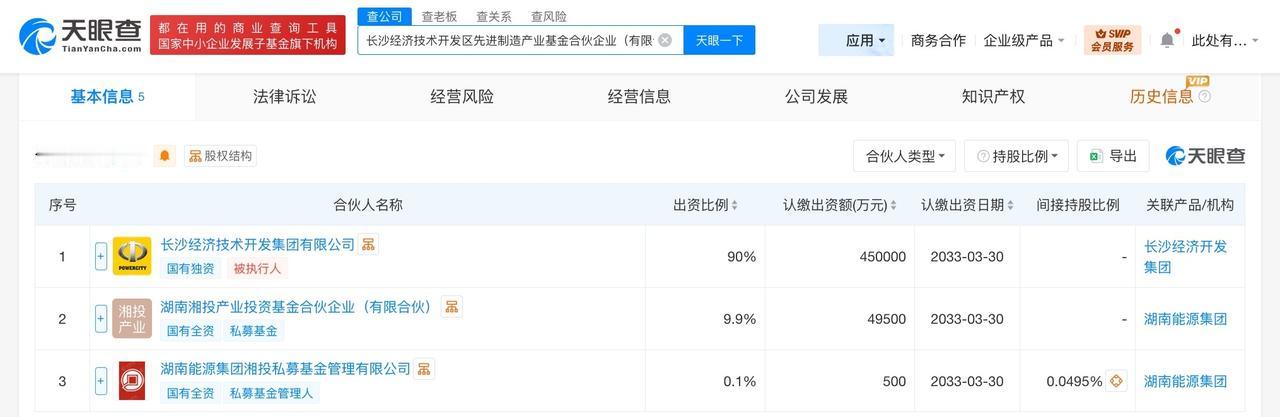 天眼查工商信息显示,近日,长沙经济技术开发区先进制造产业基金合伙企业(有限合伙)成立,执行事务合伙人为湖南能源集团湘投私募基金管理有限公司,出资额50亿人民币,经营范围为以私募基金从事股权投资、投资管理、资产管理等活动,创业投资。合伙人信息显示,该基金由长沙经济技术开发集团有限公司、湖南湘投产业投资基金合伙企业(有限合伙)、湖南能源集团湘投私募基金管理有限公司共同出资。