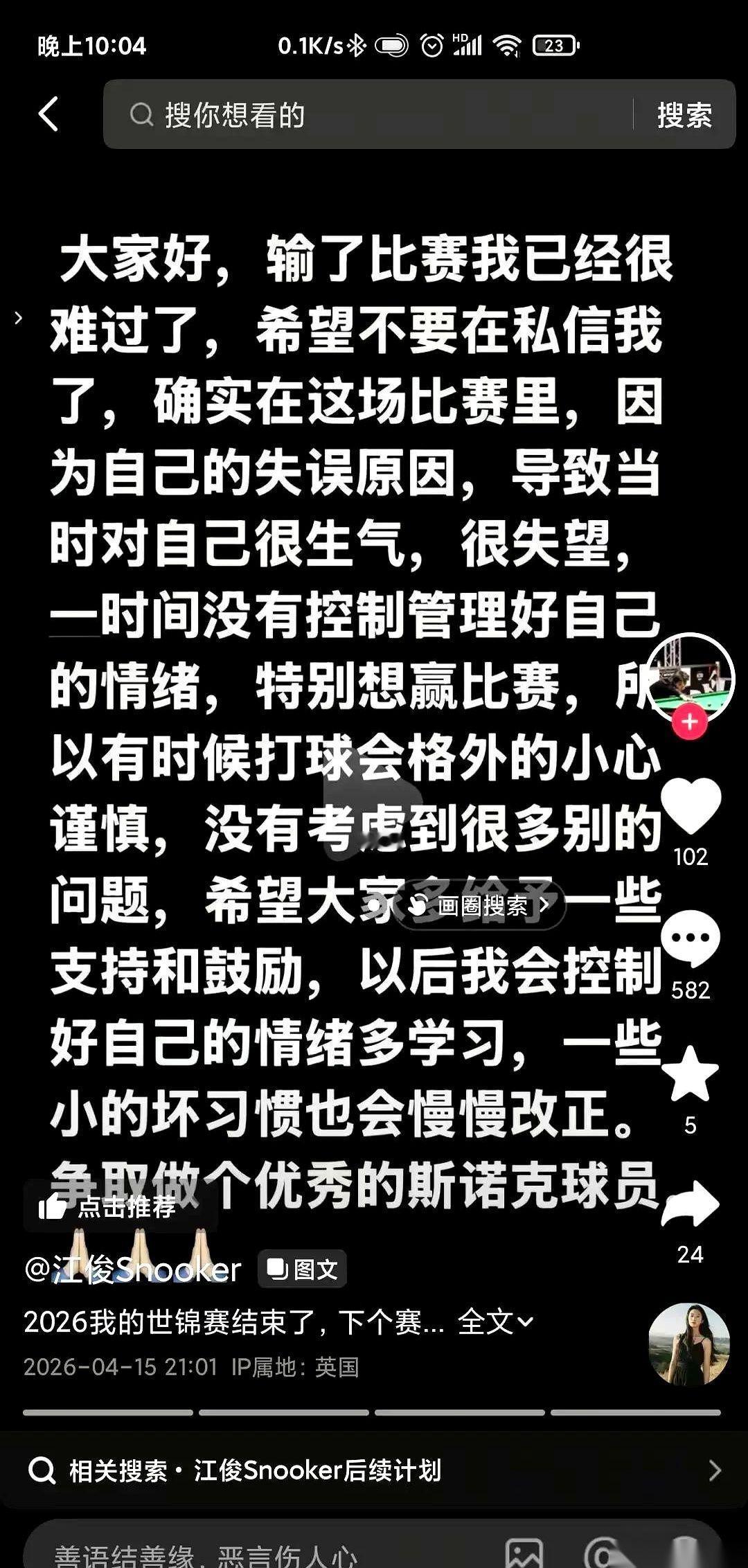 压力之下,江俊连夜发了道歉声明。目前,世界台联已经正式立案调查。