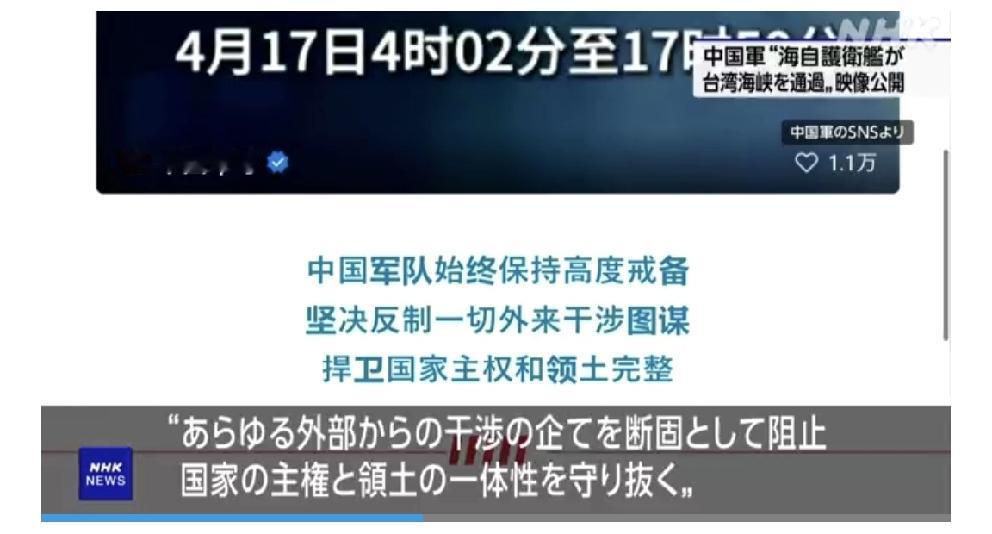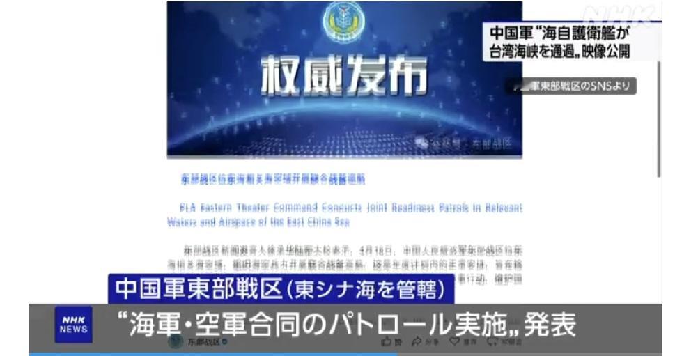日媒北京时间4月18日晚上10点59分报道,中国军队公开了海上自卫队护卫舰17日通过中国大陆和台湾之间的台湾海峡时所拍摄的视频,声称“坚决阻止一切外来干涉企图”。