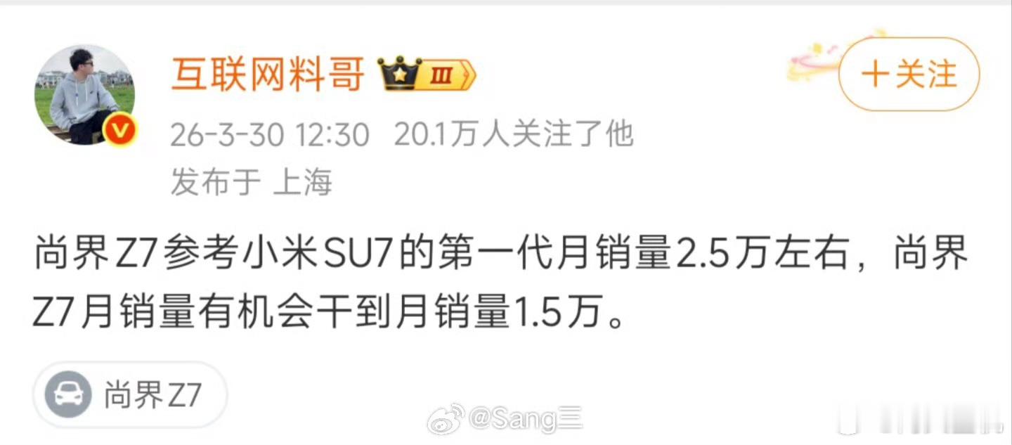 互联网料哥:尚界Z7线下门店卖爆了,月销干到1.5万,同级别唯一对小米造成冲击的车。