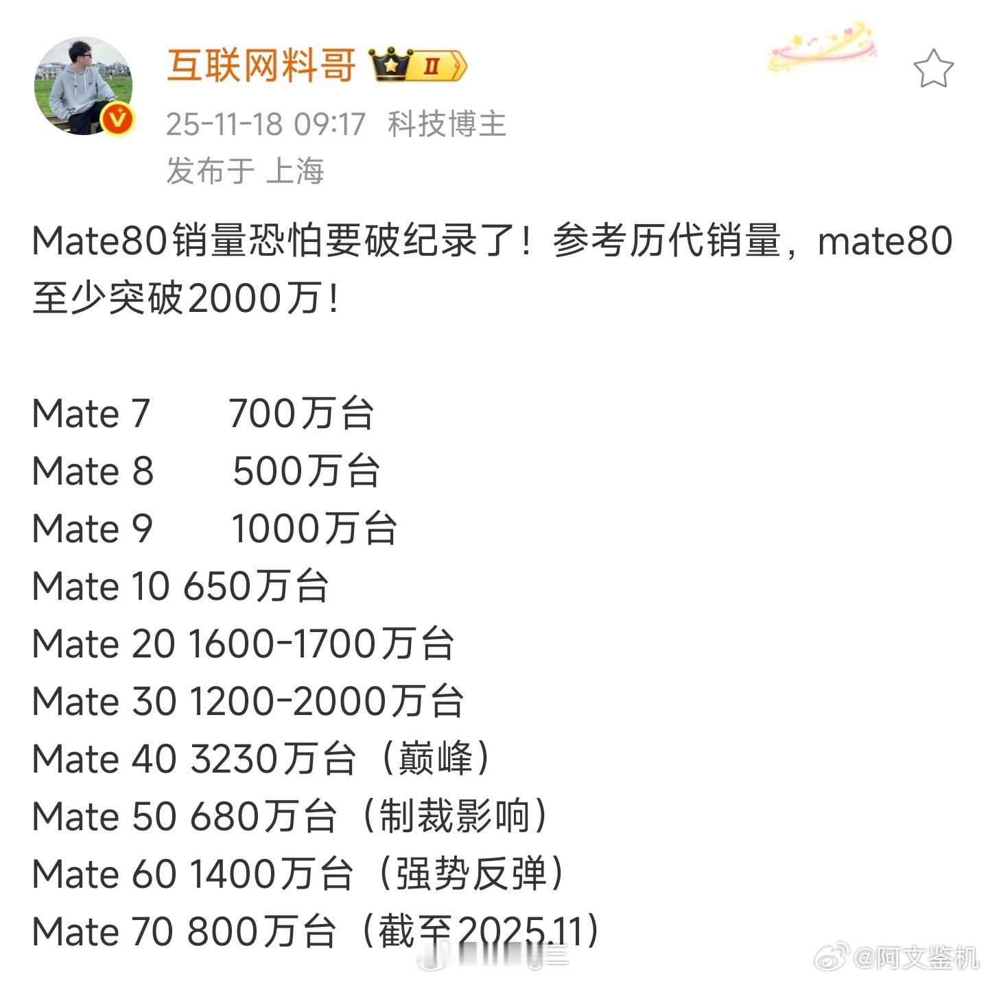 还得是料哥,车还没正式开卖,已经吹上 ,先祝大卖吧。另外问问料哥,之前预测华为Mate80销量至少破2000万的微博,到时候没卖到料哥会和汽车一起补吗?数码科技评论