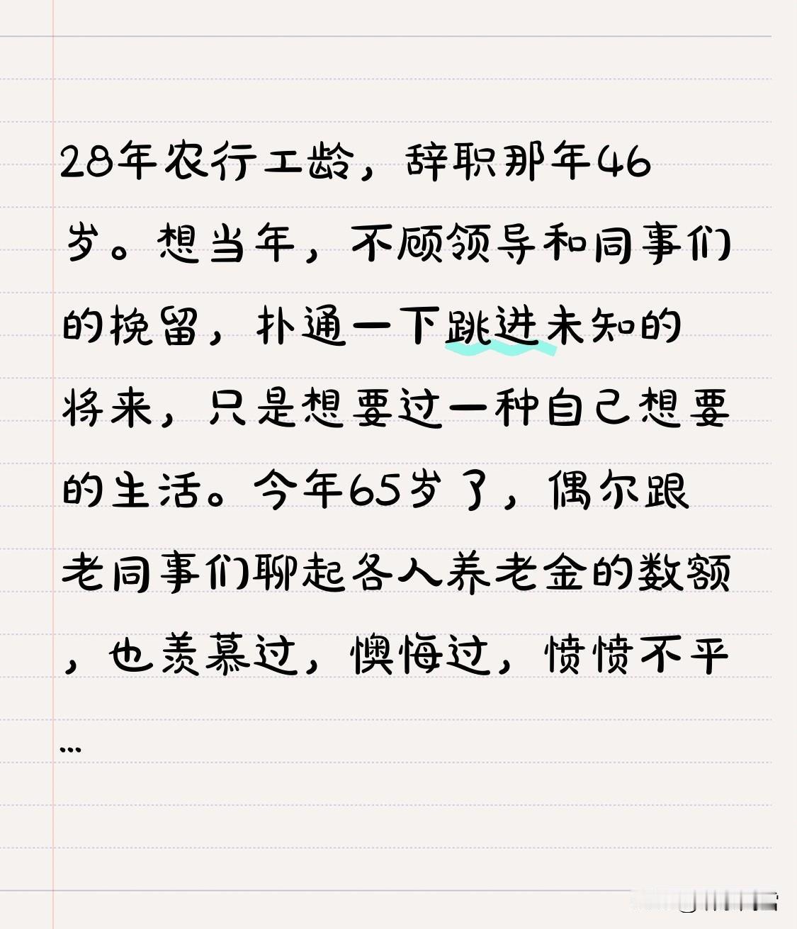28年农行工龄,辞职那年46岁。想当年,不顾领导和同事们的挽留,扑通一下跳进未知的将来,只是想要过一种自己想要的生活。