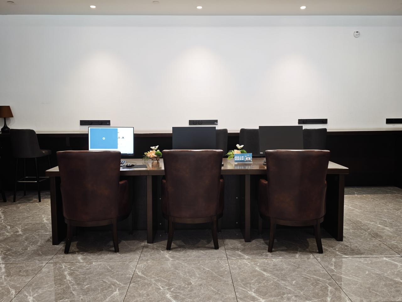 这个休息室面积很大,有一面都是落地窗,视野很好,深绿色的皮质沙发坐着也很舒适,各个功能区域布置的井井有条,还专门设置了电脑工作区域。