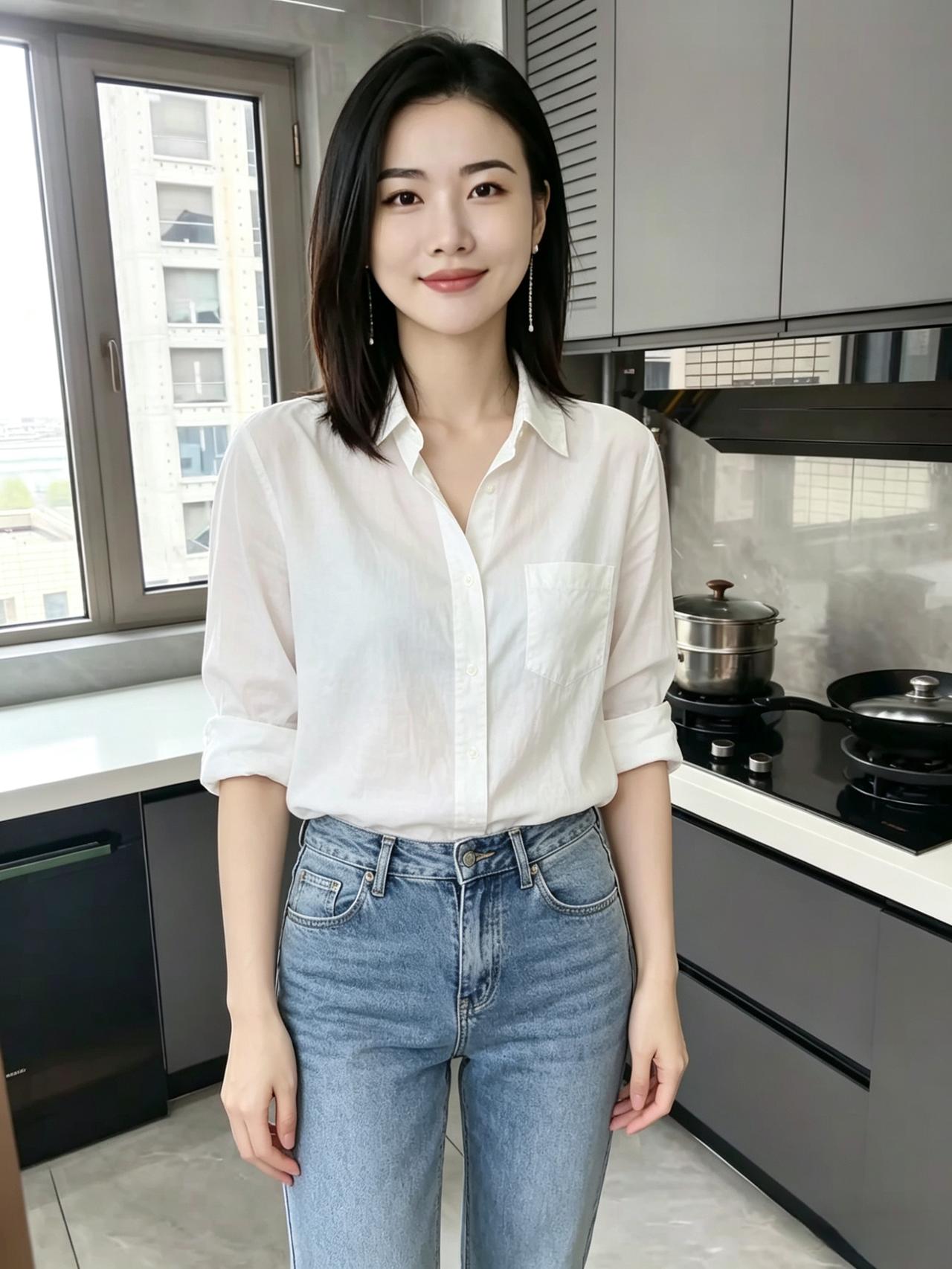 一袭白衫映玉容,牛仔裤畔起清风。 眸中藏尽山河色,笑里融开岁月融。 厨下烟火添温