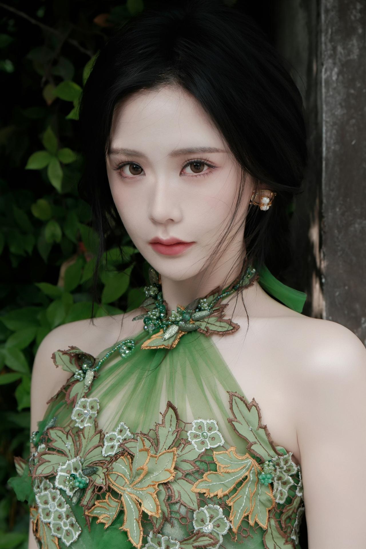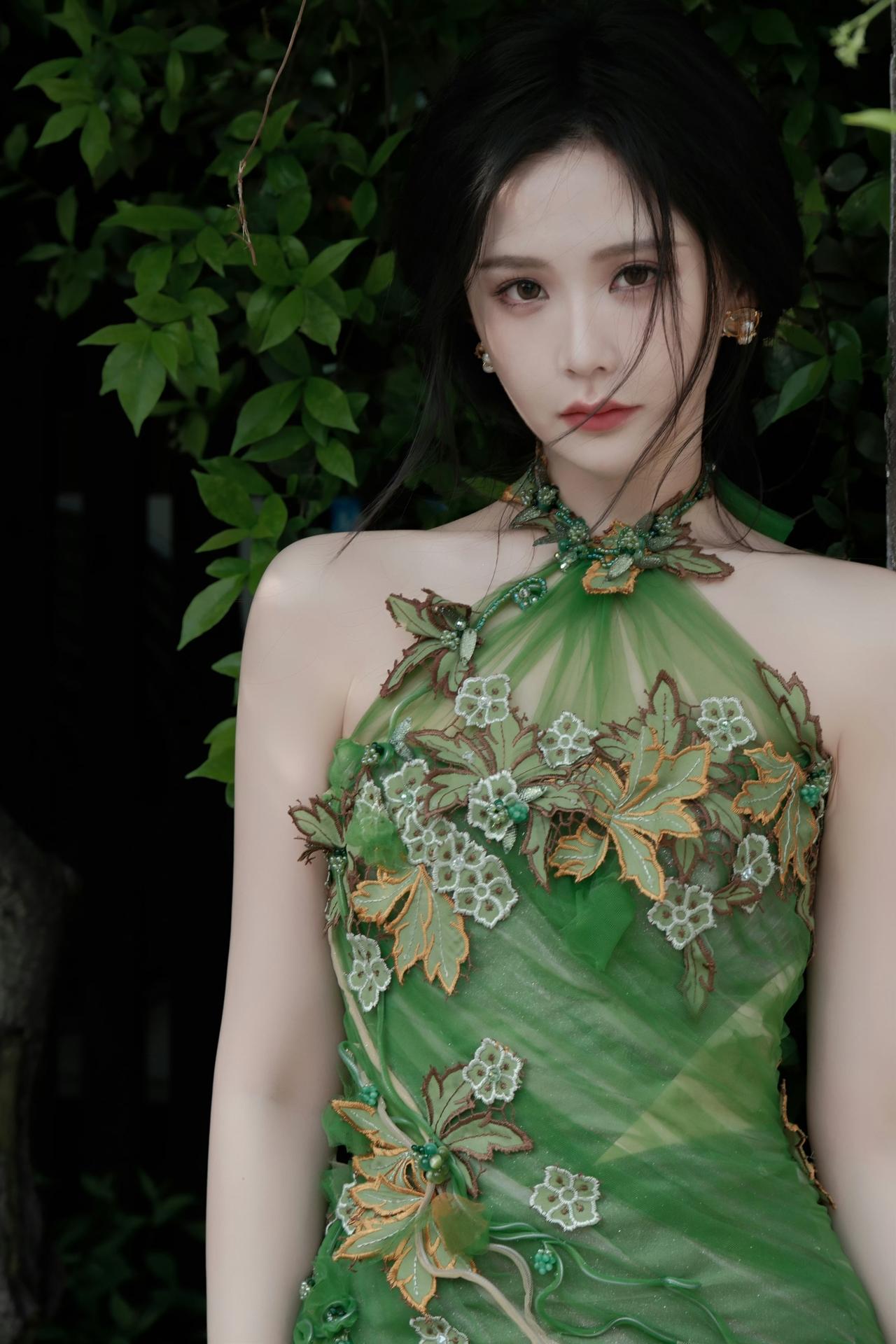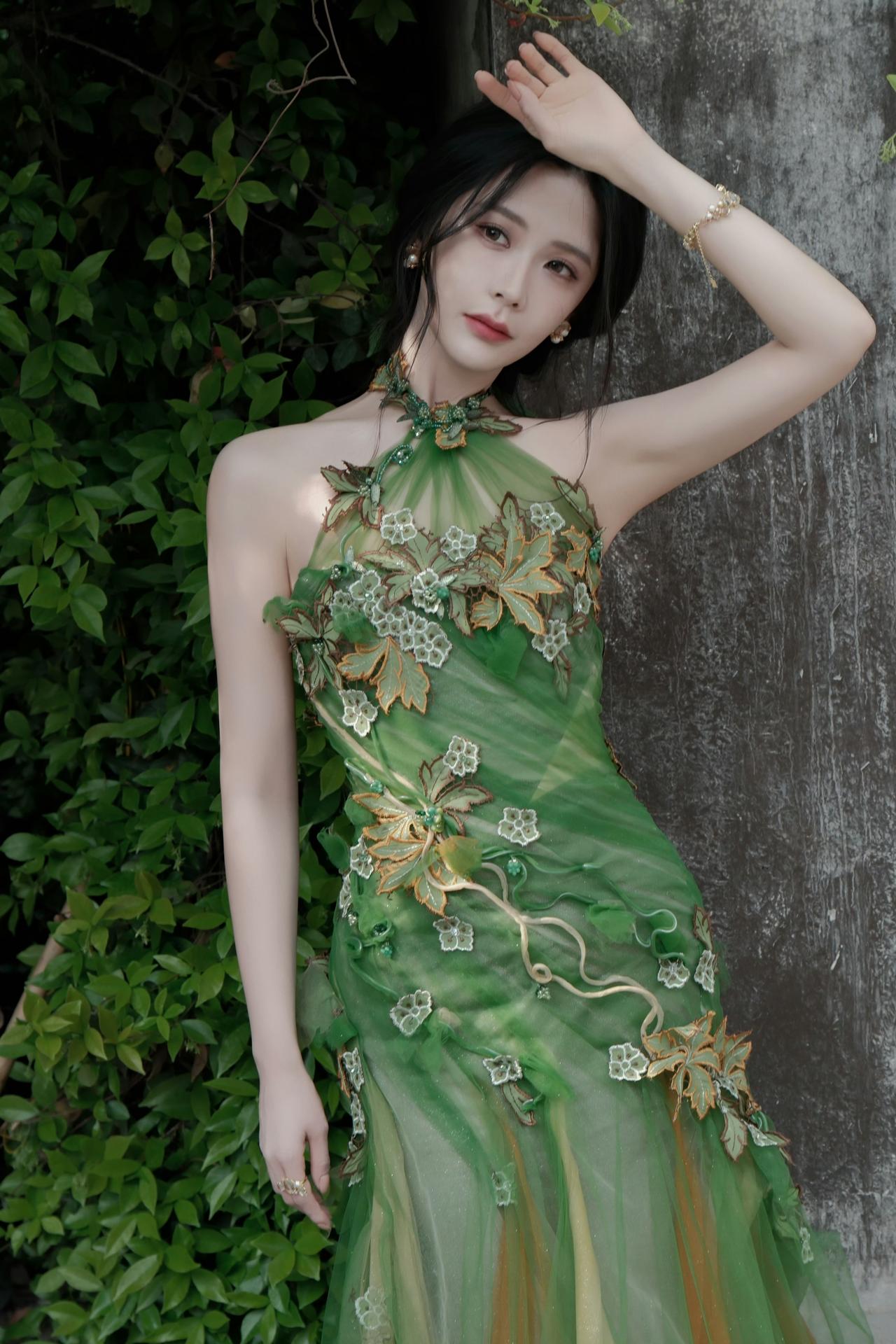 身着带有花叶装饰的绿色挂脖长裙,将古典韵味与时尚感融合,尽显优雅气质,仿佛春日里的花仙子。