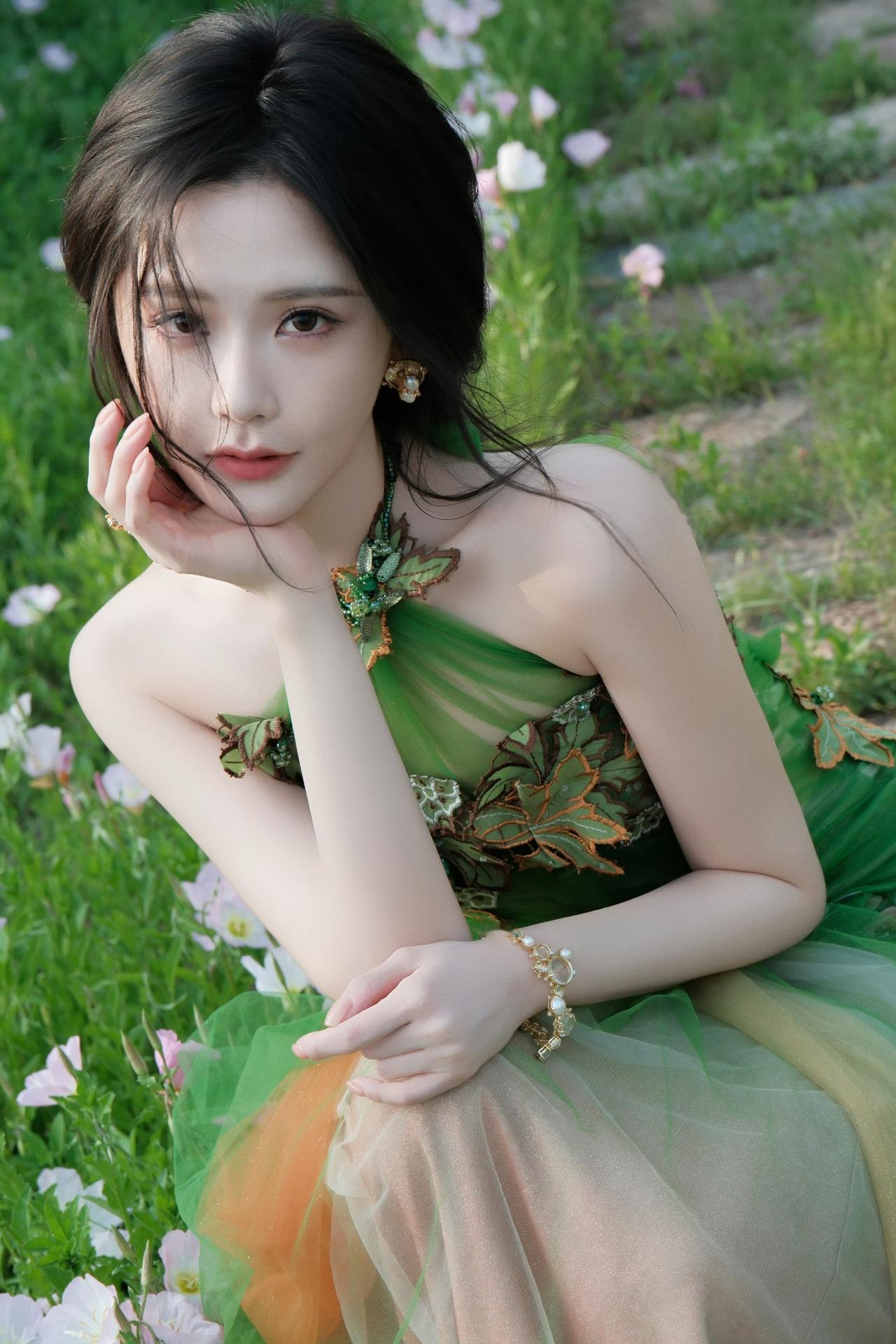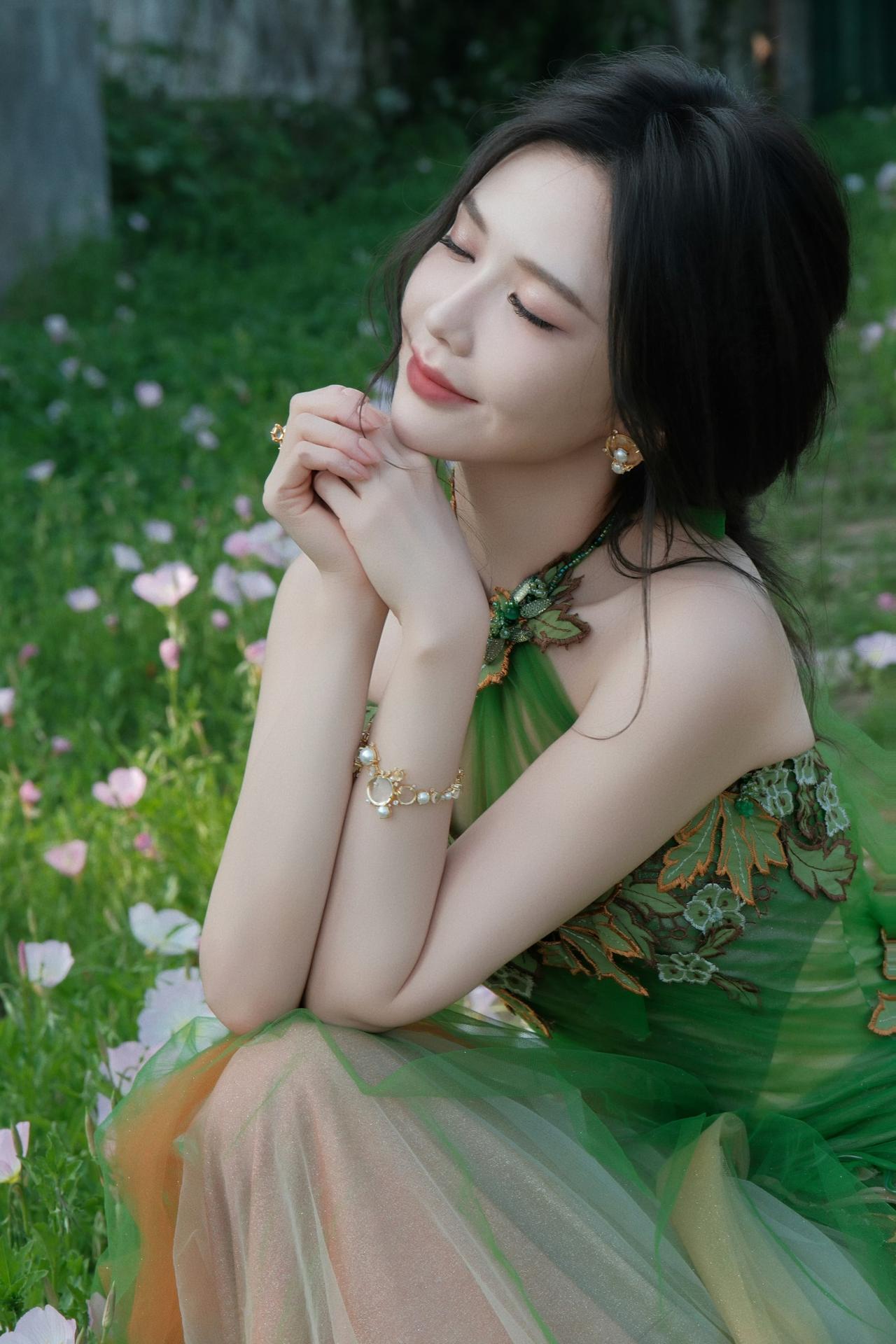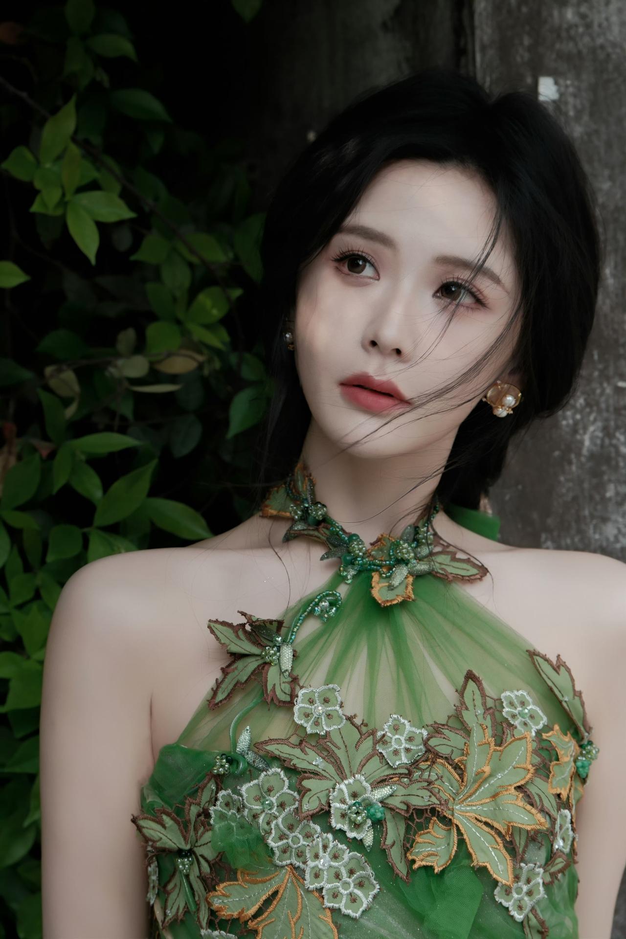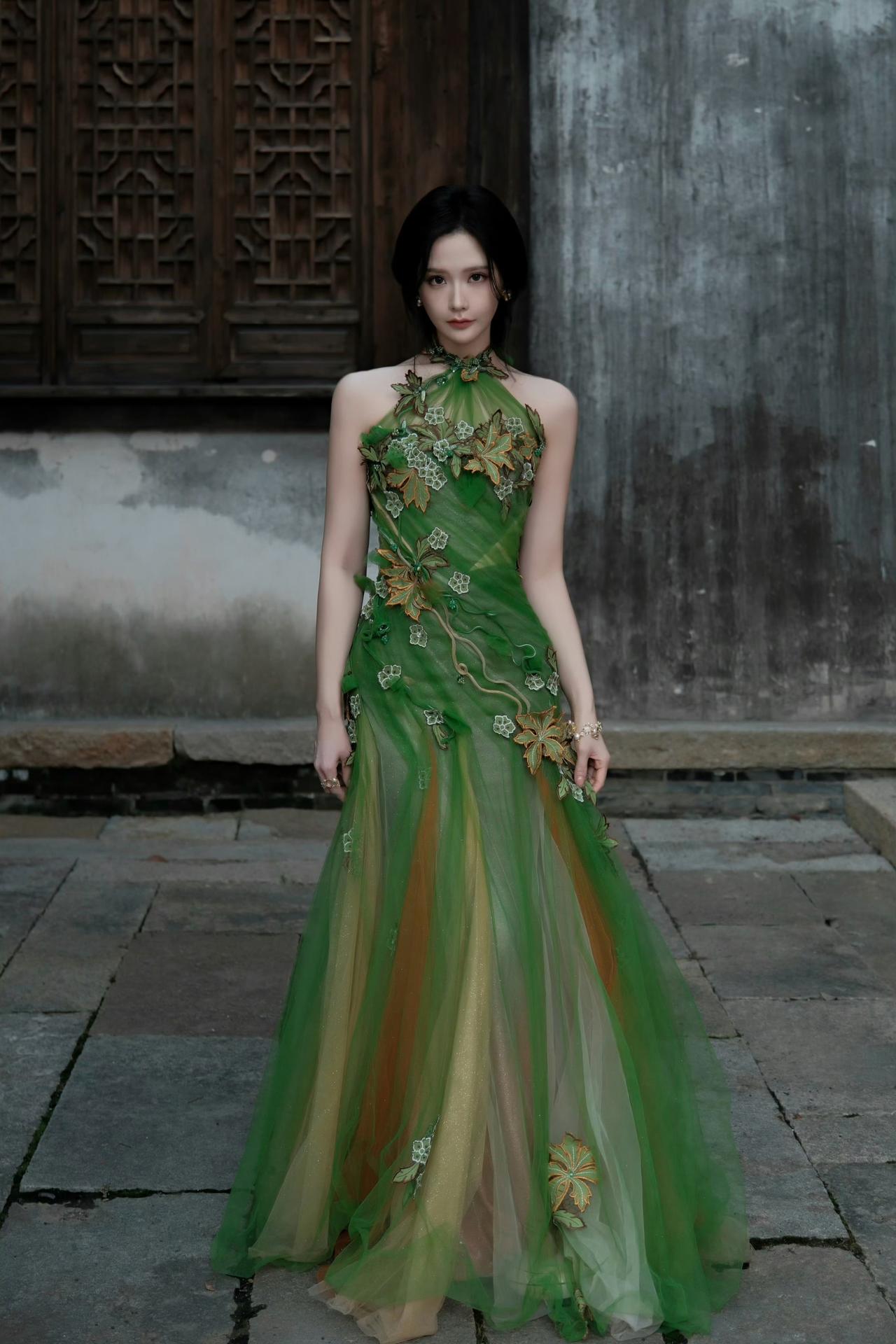 身着带有花叶装饰的绿色挂脖长裙,将古典韵味与时尚感融合,尽显优雅气质,仿佛春日里的花仙子。