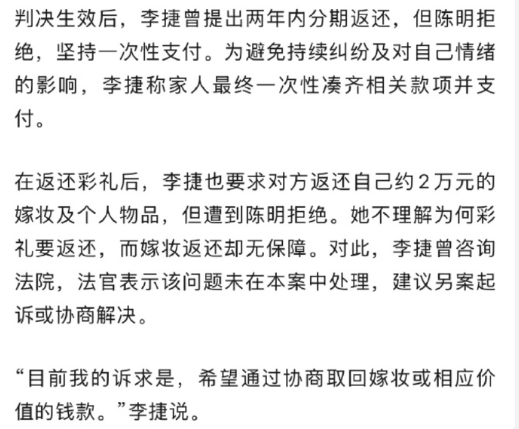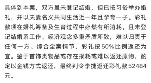 最后法院判的是彩礼三金退一半,五万多,奶粉钱给一半,三千多,其他的不支持。