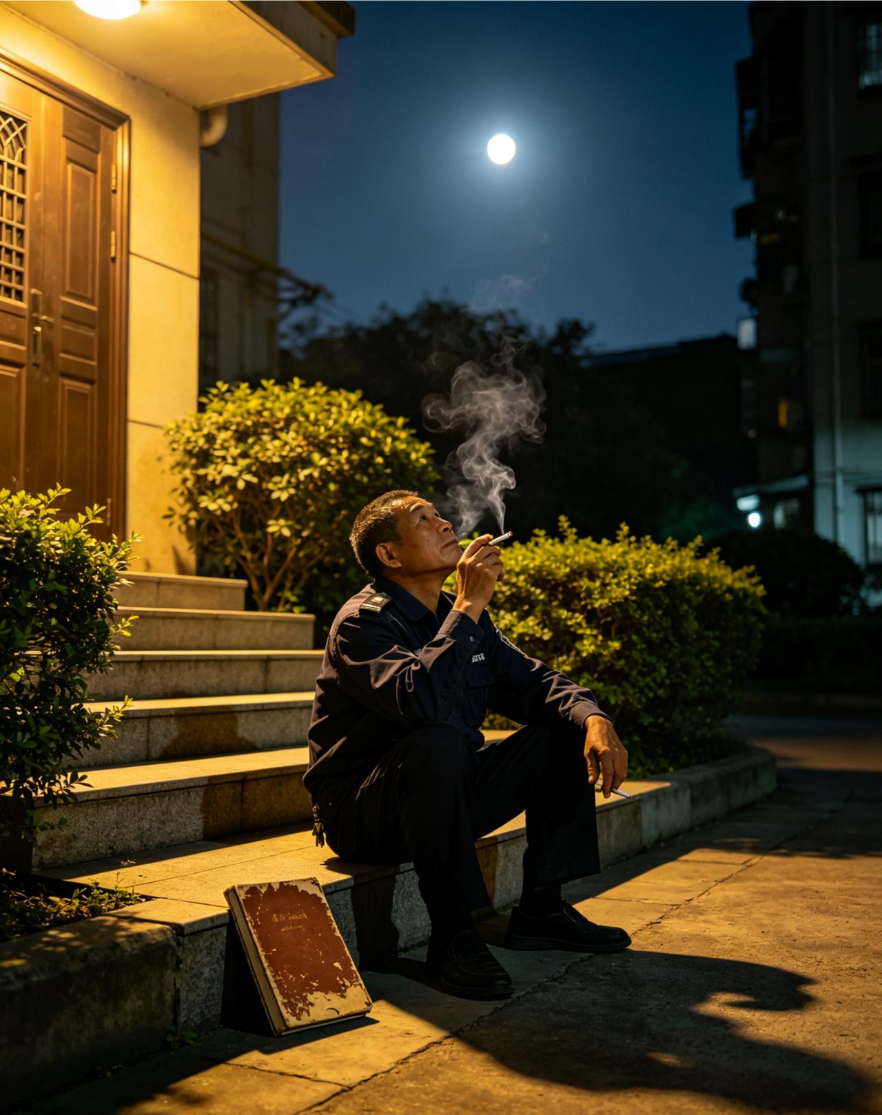 每天夜里巡逻结束,他就安静坐在小区的台阶上,点一根廉价的香烟,看着月亮慢慢划过夜空。风吹日晒,雨打霜落,三年时间,我从没听过他说一句抱怨的话,从没见他垂头丧气过。