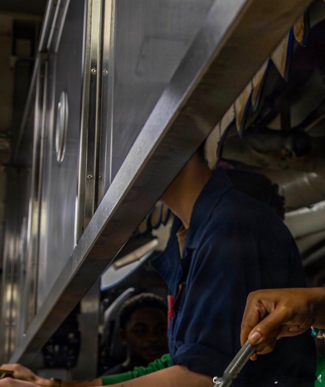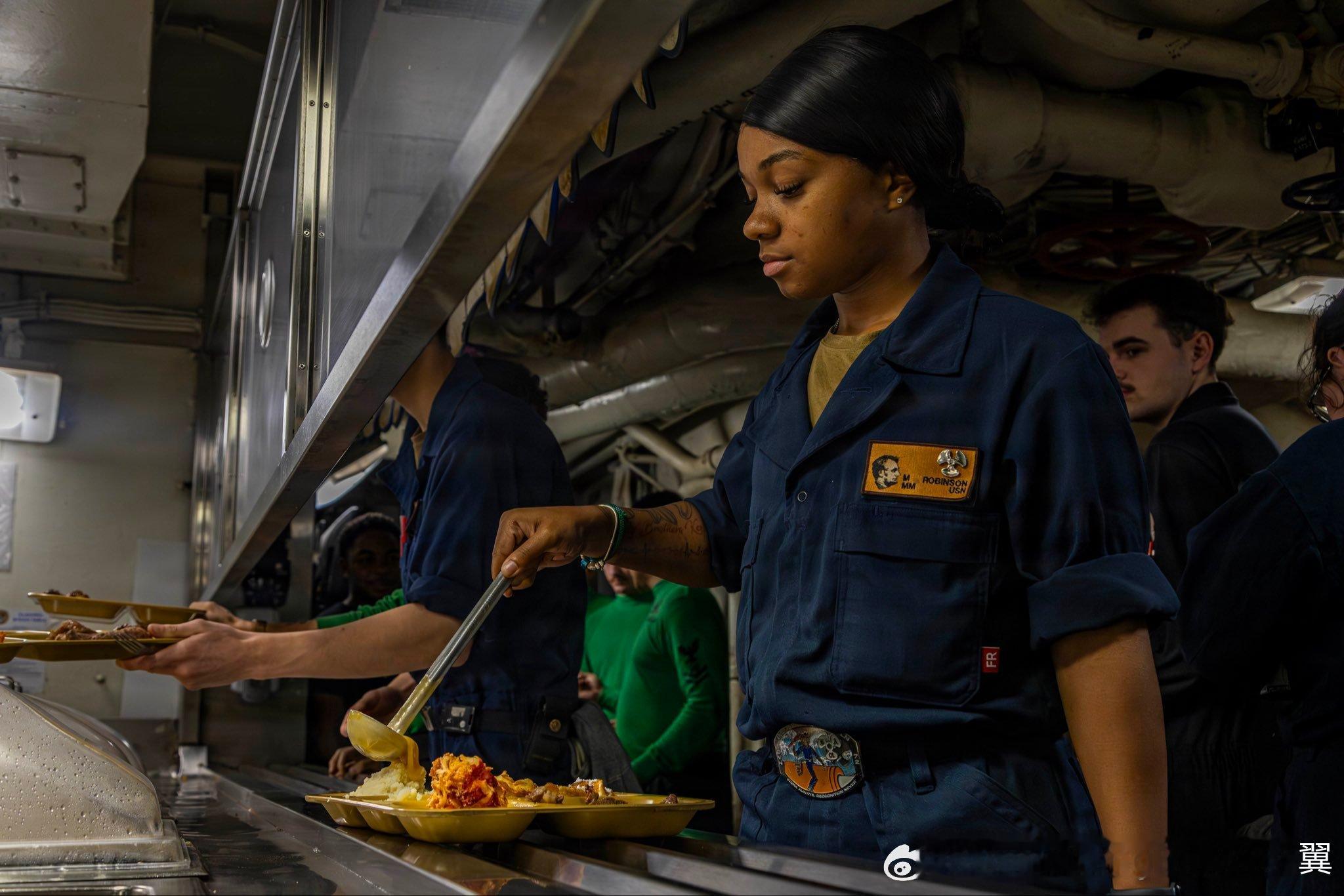 美伊以冲突 美国海军辟谣说“林肯”号航母和“的黎波里”号两栖攻击舰上的水兵并没有出现食物短缺,但被人说是AI照片,因为一个家伙的脸贴到了挡板上(图5),服务员的手指也不正常(图6)。