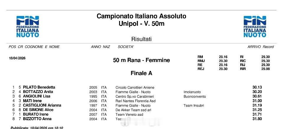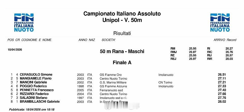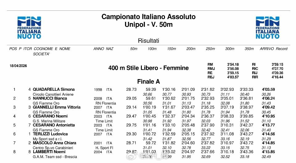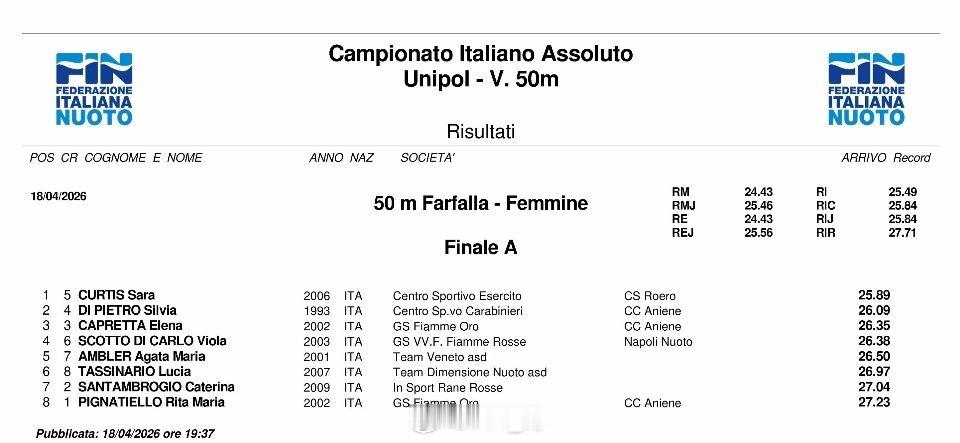 意大利游泳锦标赛 最后一天决赛男1500自:Gregorio Paltrinieri 14:58.03男50蛙:Simone Cerasuolo 26.51女400自:Simona Quadarella 4:03.59女50蛙:Benedetta Pilato 30.13女50蝶:Sara Curtis 25.89