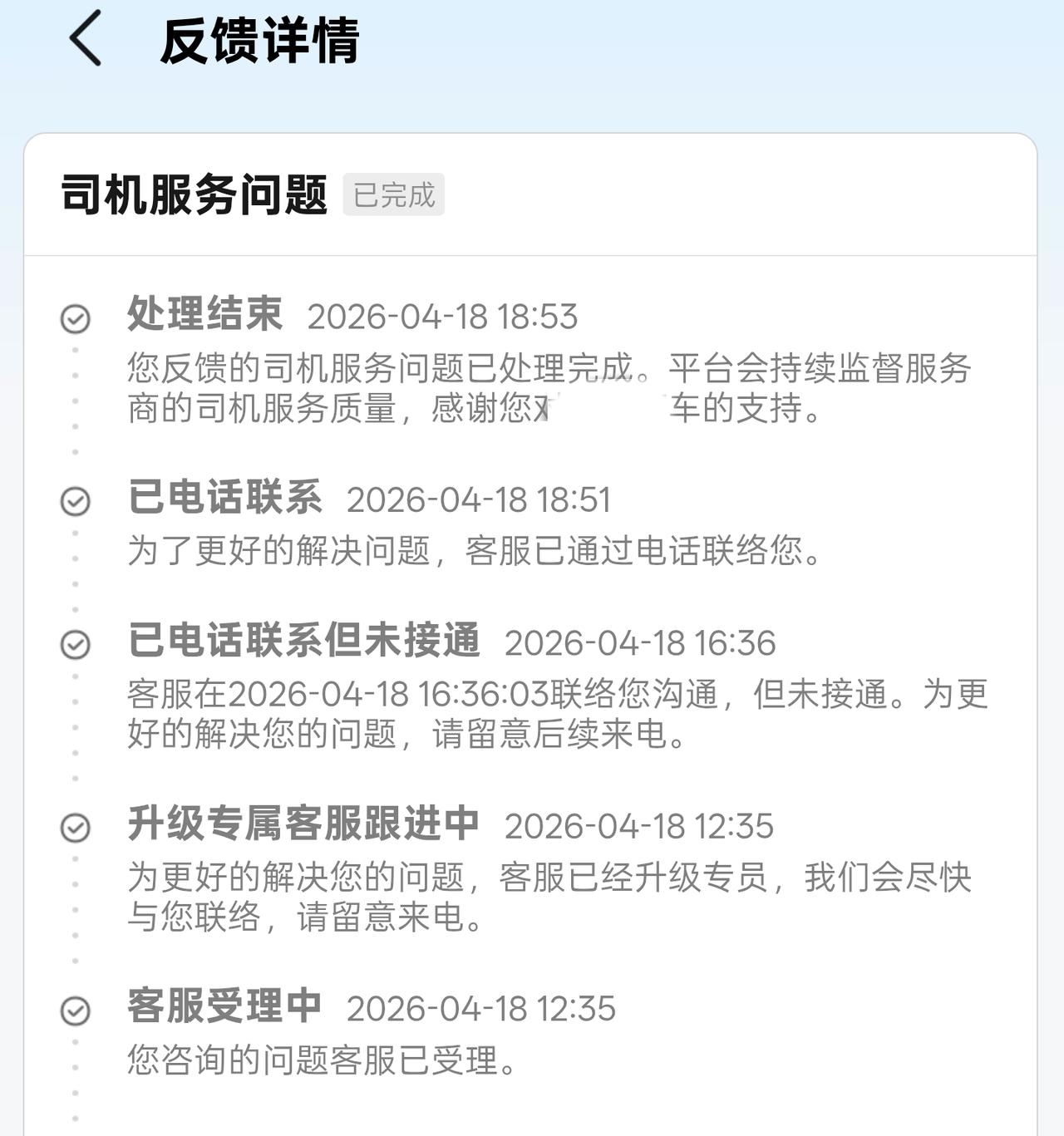 昨天平台客服打来电话,同短信通知我处理结果,同时送了我3张打车优惠券。