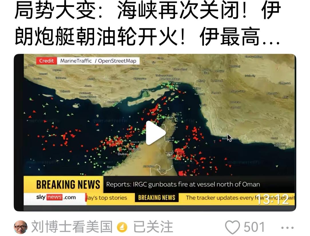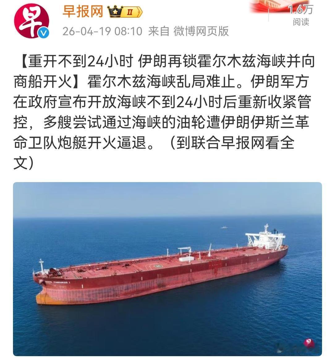 伊朗外长宣布开放不到24小时 伊朗军方再锁霍尔木兹海峡并向商船开火。由此可见,伊朗国内高层对战与和的观点不统一,关键的症结是新上任的宗教领袖不露面。目前主战派占上风,在主战派被打垮后,主和派来收拾残局。
