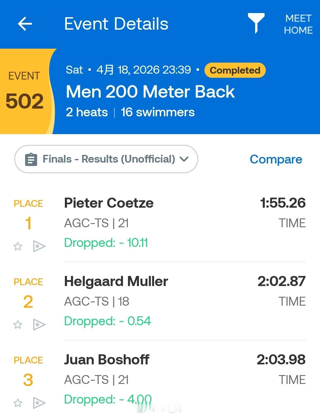南非游泳锦标赛 最后一天决赛男200仰:Pieter Coetze 1:55.2
