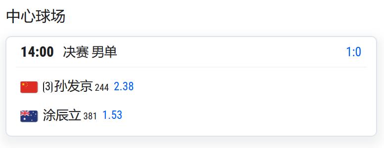 CH50武宁,孙发京将与澳大利亚的涂辰立争夺男单冠军。