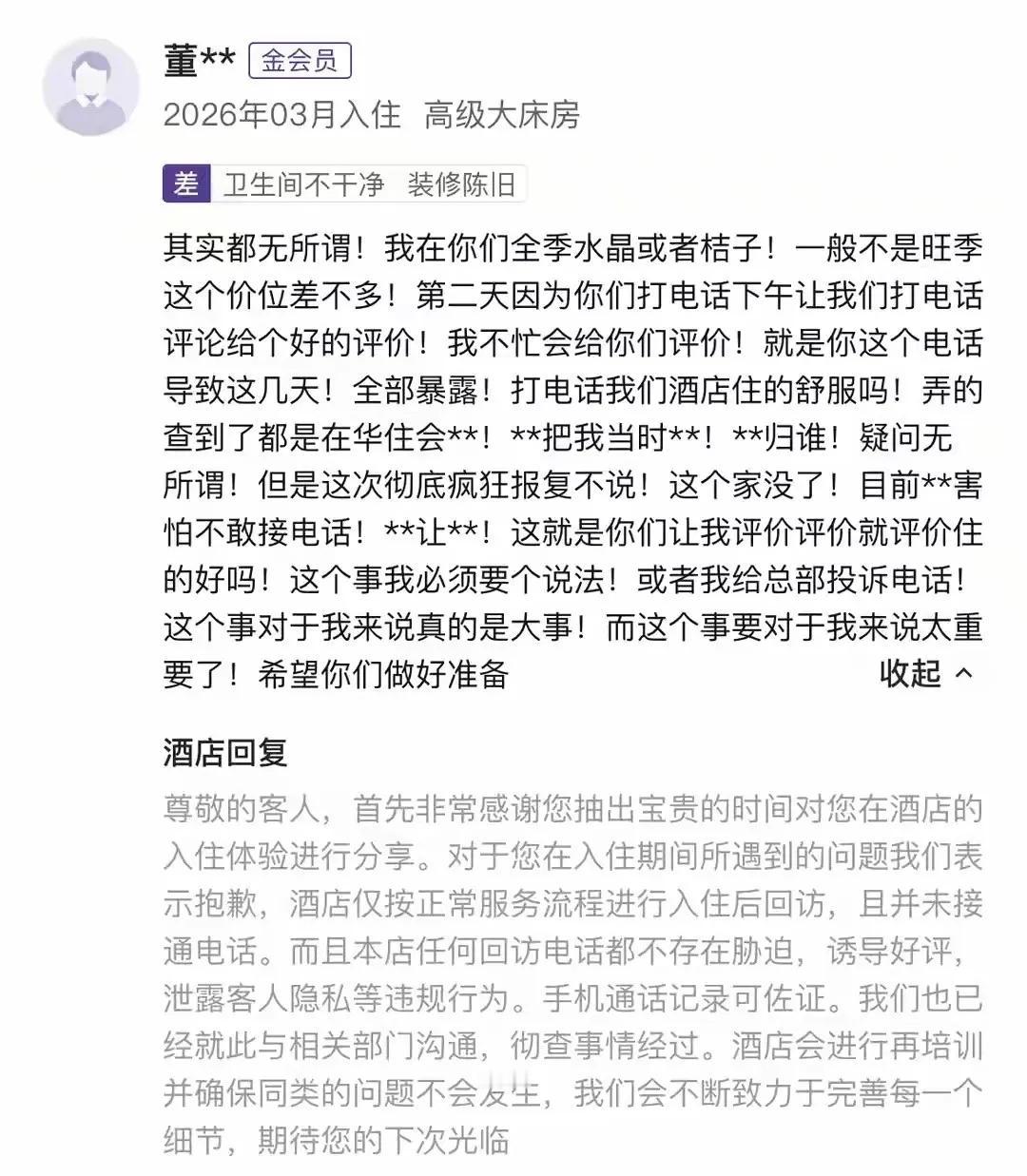 酒店表示,当时的回访电话根本就没打通,只是正常的入住满意度回访,也从来没有向任何人泄露过她的入住信息,不可能是酒店的电话导致她的事暴露。