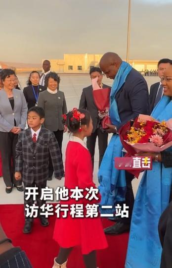 总统夫人则选择深灰格纹收腰大衣,一身深色春装低调又不失优雅,下了飞机就收到小朋友送来的鲜花与哈达,画面温馨有爱。