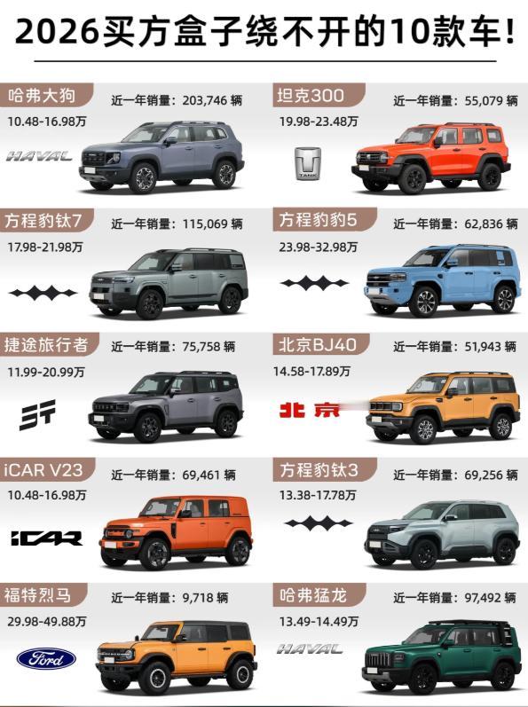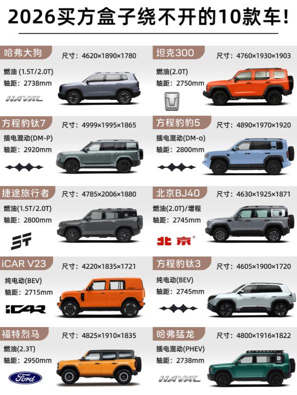 属于年轻人的第一台方盒子,你会pick哪台?🚗 曾向往仗剑走天涯,看遍世间繁华,年轻人的诗和远方,怎能少一台方盒子相伴~ 本期精选10台越野/SUV,兼顾旷野豪情与城市烟火,无论是燃油的轰鸣还是新能源的静谧,总有一款戳中你!