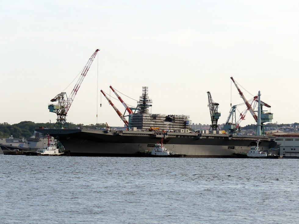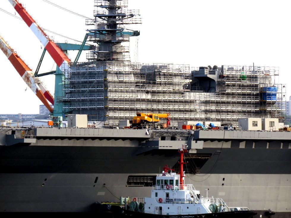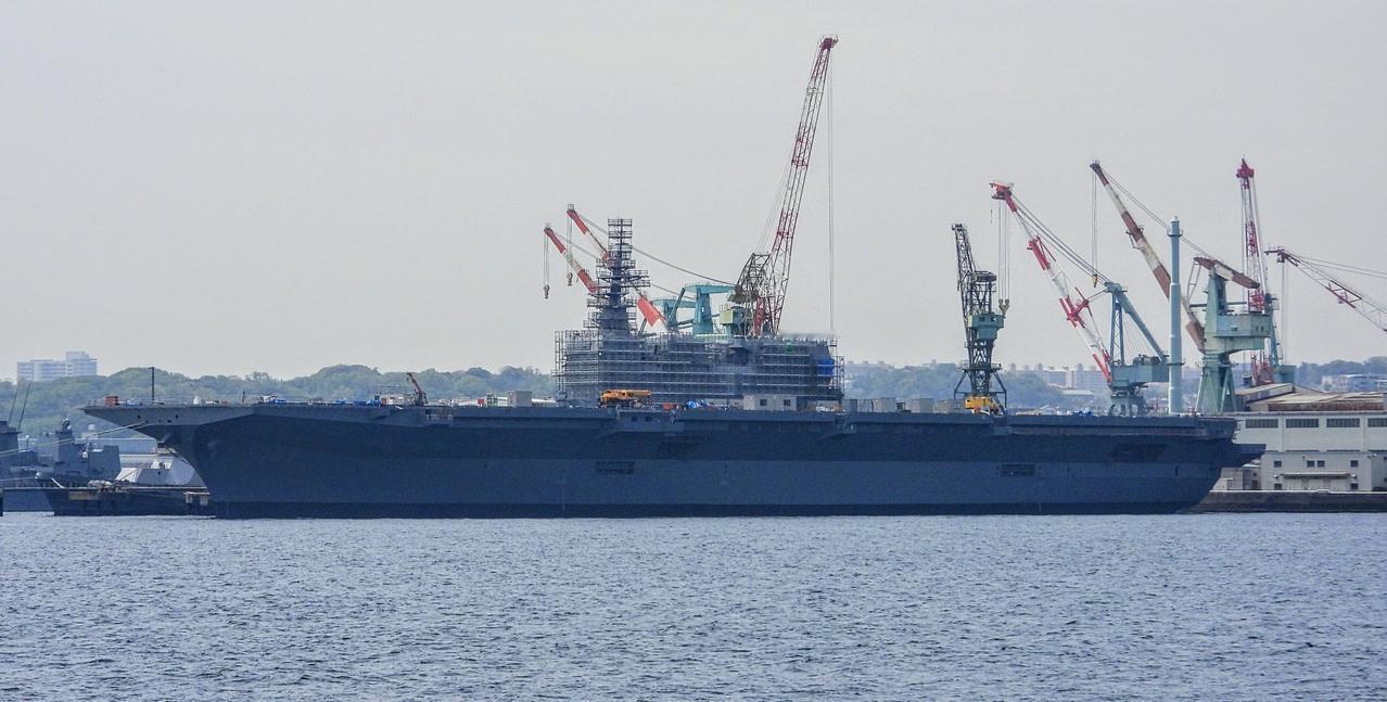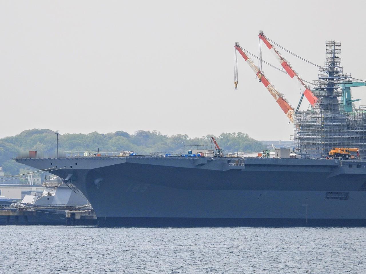 改装中的日本海自出云号轻型航母 舰艘已经拉平,舰岛改装中