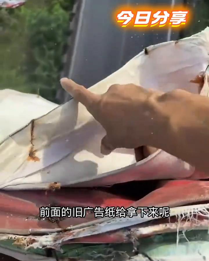 这是一二三四五,好家伙,我是万万没有想到高速公路两边的那种大的广告牌竟然就是这么安装上去的。可是我就有点搞不懂了,这数来数去足足已经有二十多层了,为什么也不把前面的旧广告纸给拿下来?要想干这个活儿至少得三个人,因为面积太大了,关键再这样贴下去是不是就超重了?还是说本来就是这样做的,数一数,这就是广告牌的年轮。