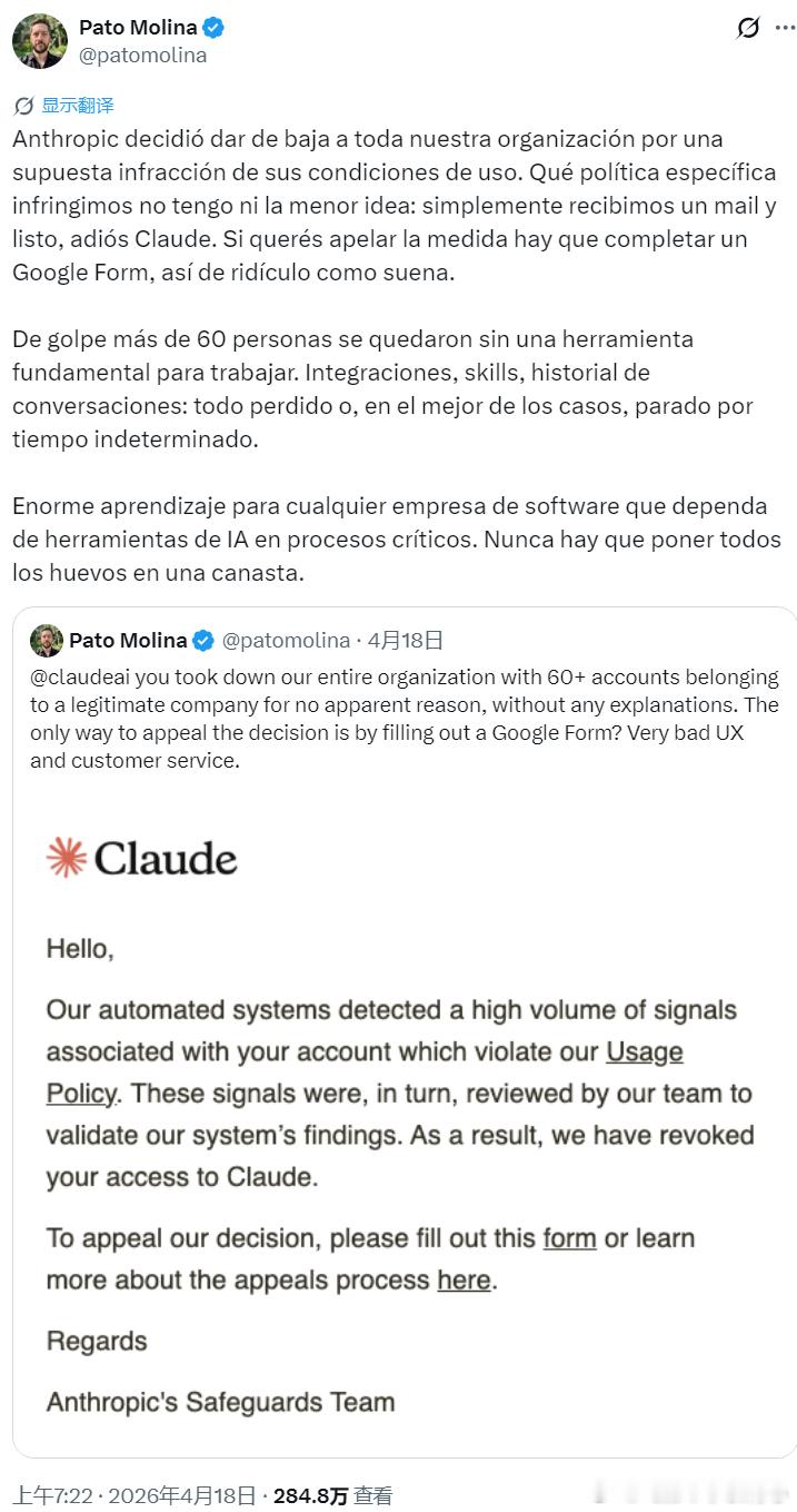 “Anthropic决定以所谓违反使用条款为由,停用了我们整个组织的账户。至于到底违反了哪一条具体政策,我完全不知道:我们只是收到了一封邮件,然后就这样——再见了Claude。如果想申诉,还得填写一个Google表单,听起来多荒唐就有多荒唐。