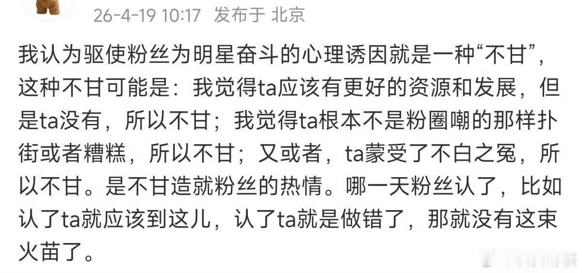 刷到一个说法——“粉圈意义上的流量,其实不是粉丝单单能成就的,是整个内娱粉圈共同成就的,其他人的在意,就会成就粉圈流量。”所以要成为流量,必须有对家,必须撕,必须虐粉、被嘲,激起粉丝反弹和死忠。粉丝为艺人奋斗的心理诱因是“不甘”。