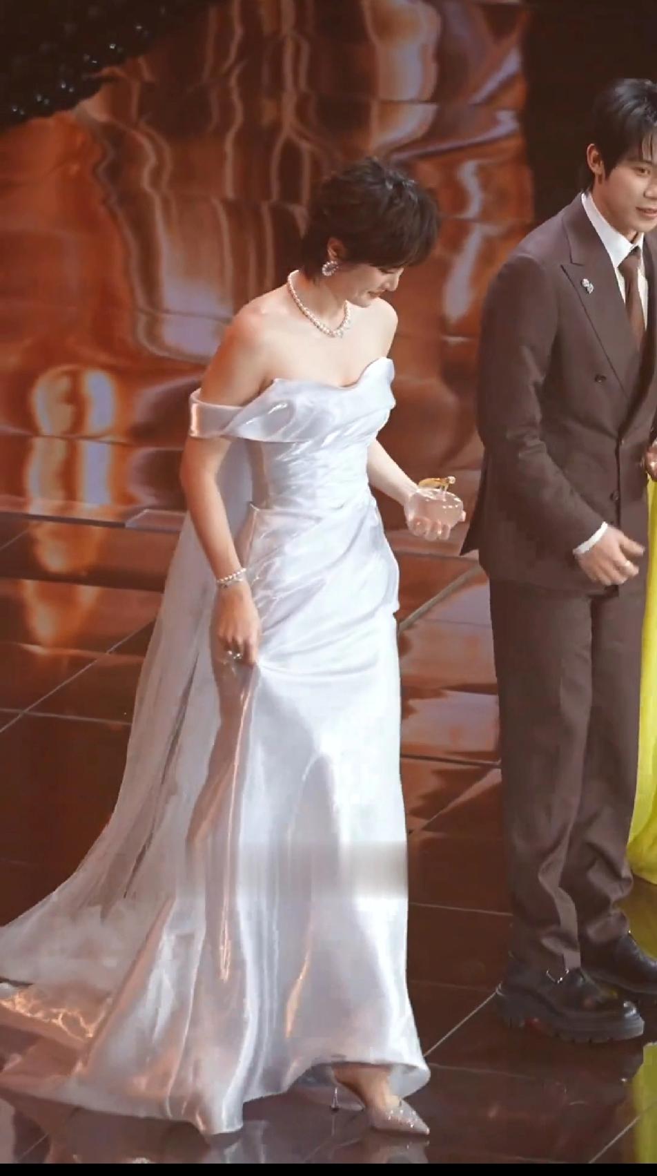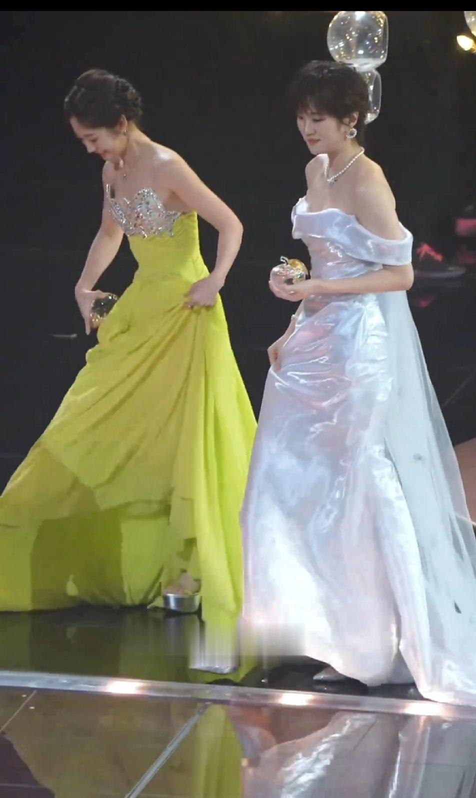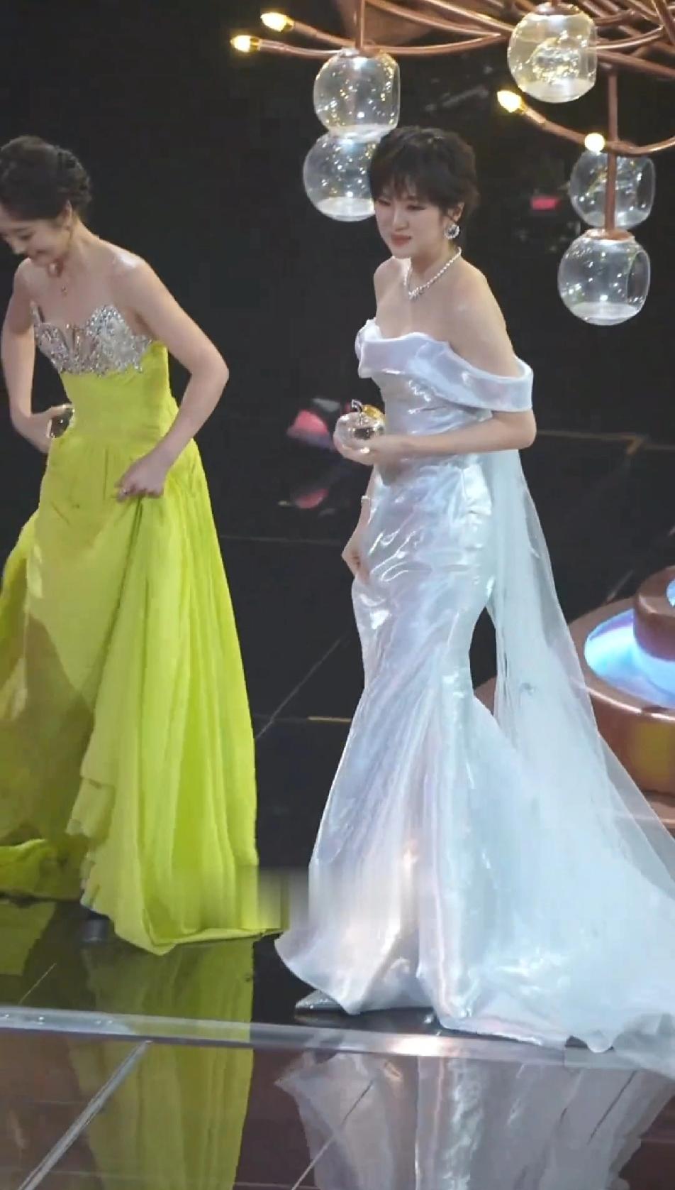 姚安娜三线艺人,顶流的排面,她的礼服是不用提的,裙摆是不用踢的,因为量身定做的裙子又合身又丝滑,裙子长度刚刚好到脚面,利落又好走,一看就是照着姚安娜的身高定做的,根本不用担心裙子太长或者太大。相比之下,邢菲在旁边费力的拖拽长裙就显得有点尴尬,她的裙子明显太长,生怕一个不小心就被裙摆绊倒,虽然邢菲穿的裙子颜色更鲜艳,但目光根本无法从姚安娜穿的浮光锦礼服上挪开,这飘逸的质感,炫目的光泽,真的美不胜收!
