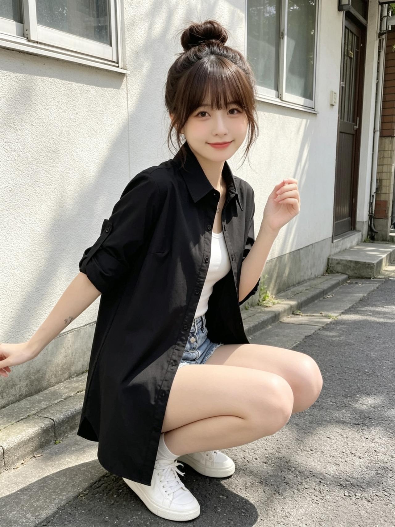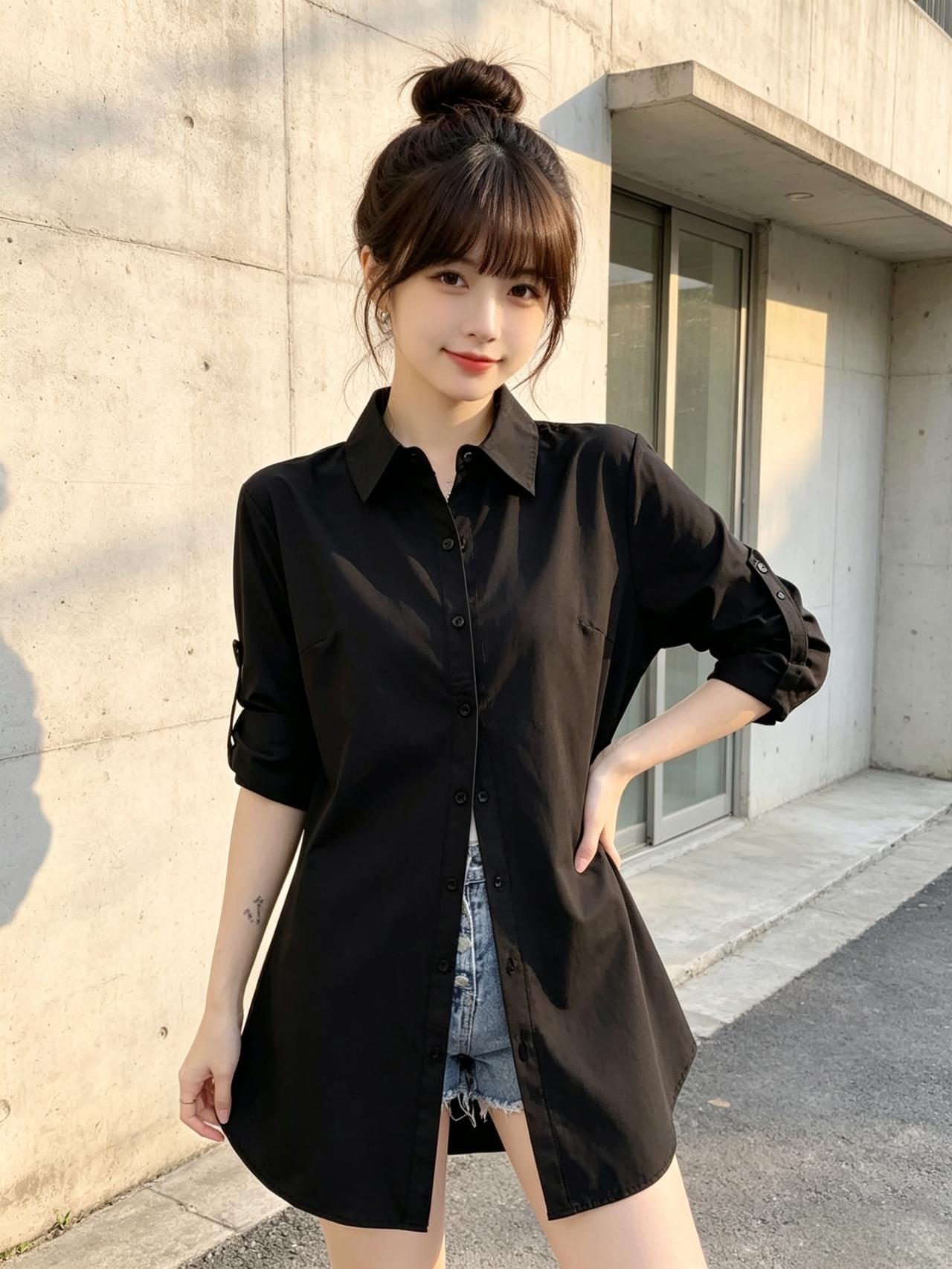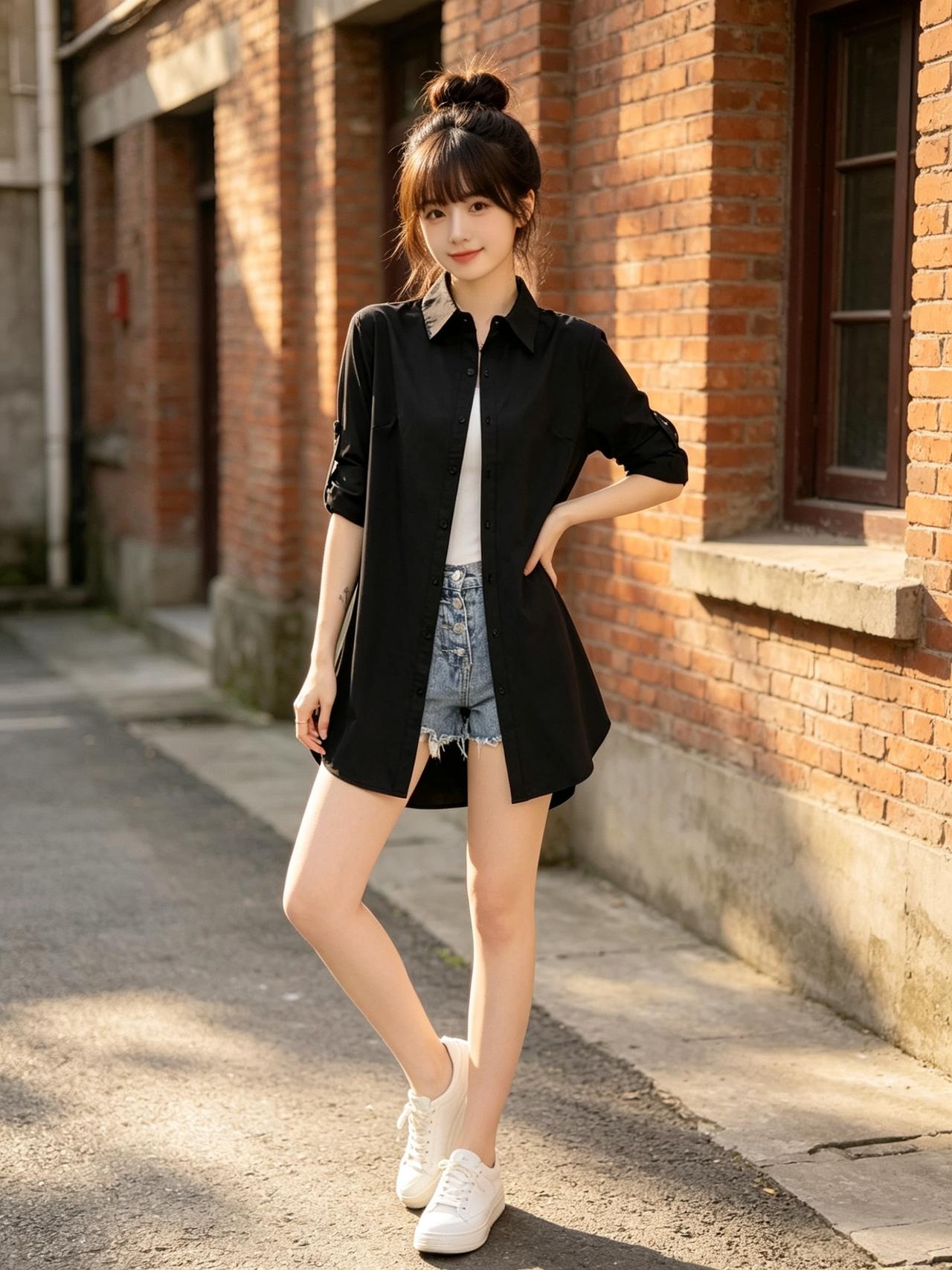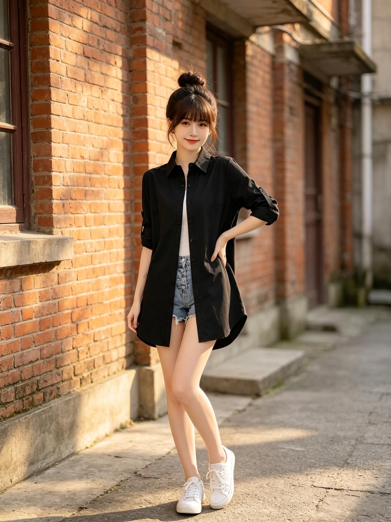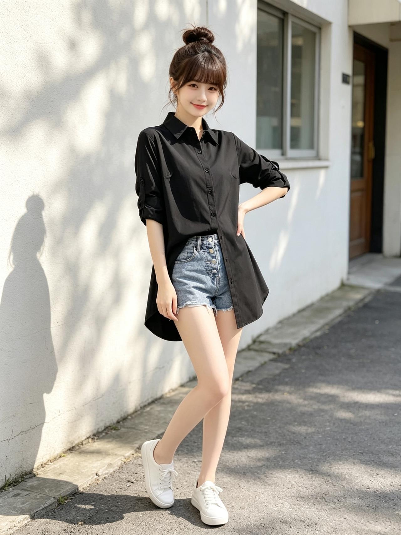 一个女孩穿着黑色衬衫和牛仔短裤,靠在墙边。气质穿搭怎么穿才恰到好处? 高级感穿搭,温柔风穿搭。