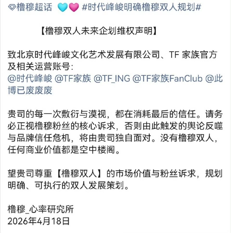 橹穆双人未来企划维权声明时代峰峻遭王橹杰穆祉丞CP粉强硬维权!橹穆CP粉丝氪金实力能打,累计消费破千万,双人舞台热度居高不下,却始终被公司冷处理,无正规双人策划、无专属双人物料,粉丝多次反馈均被无视。