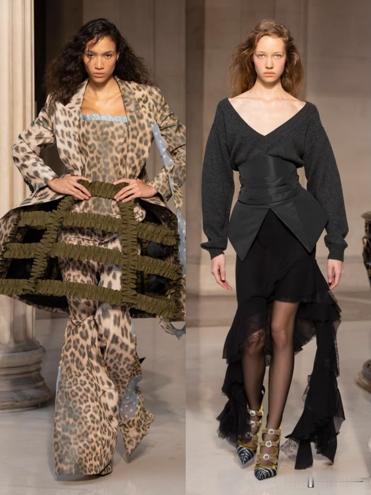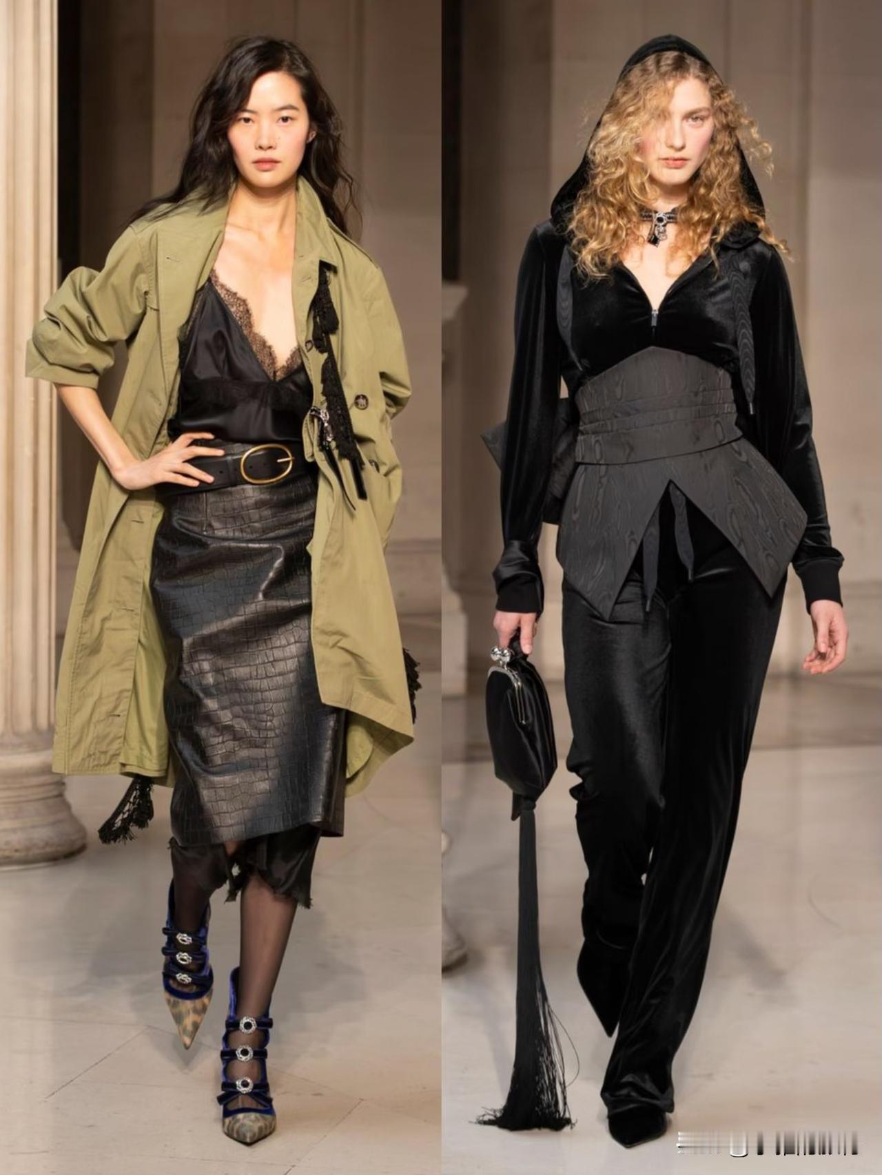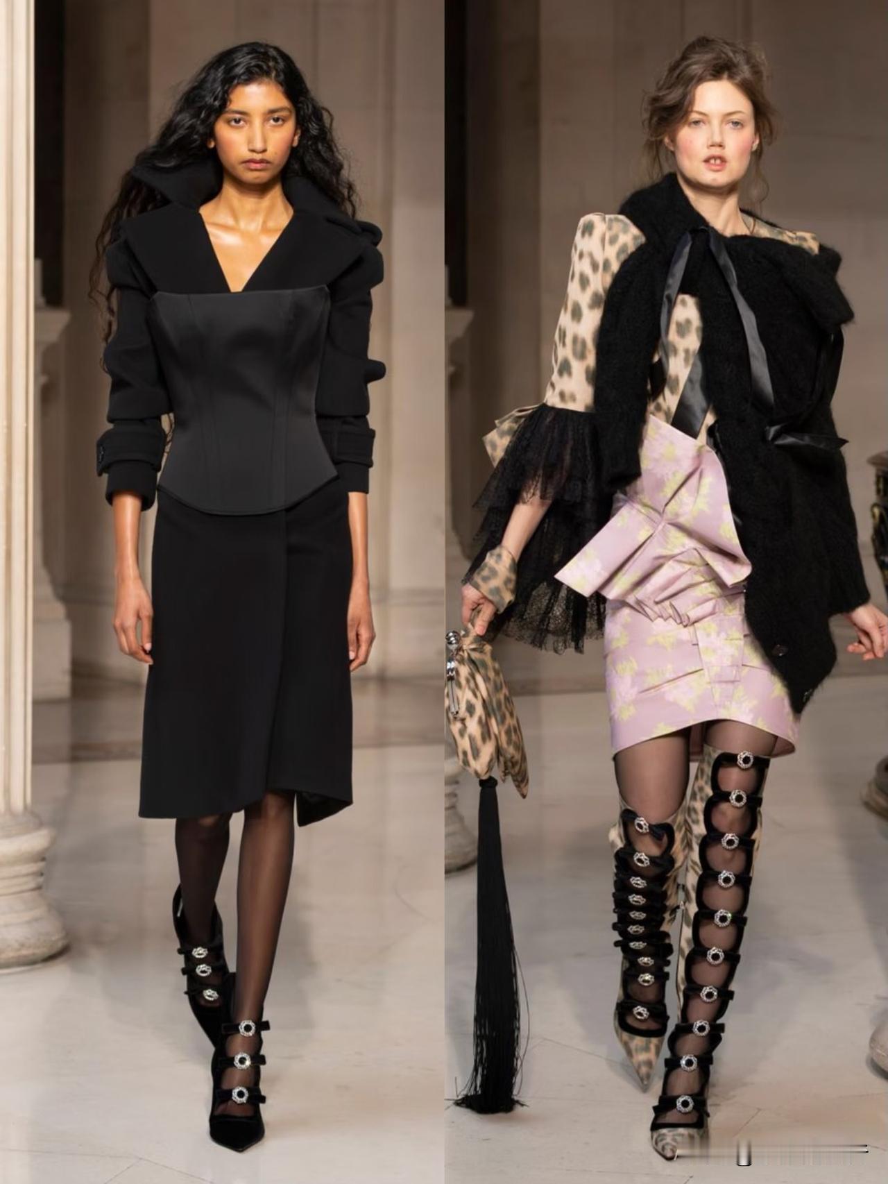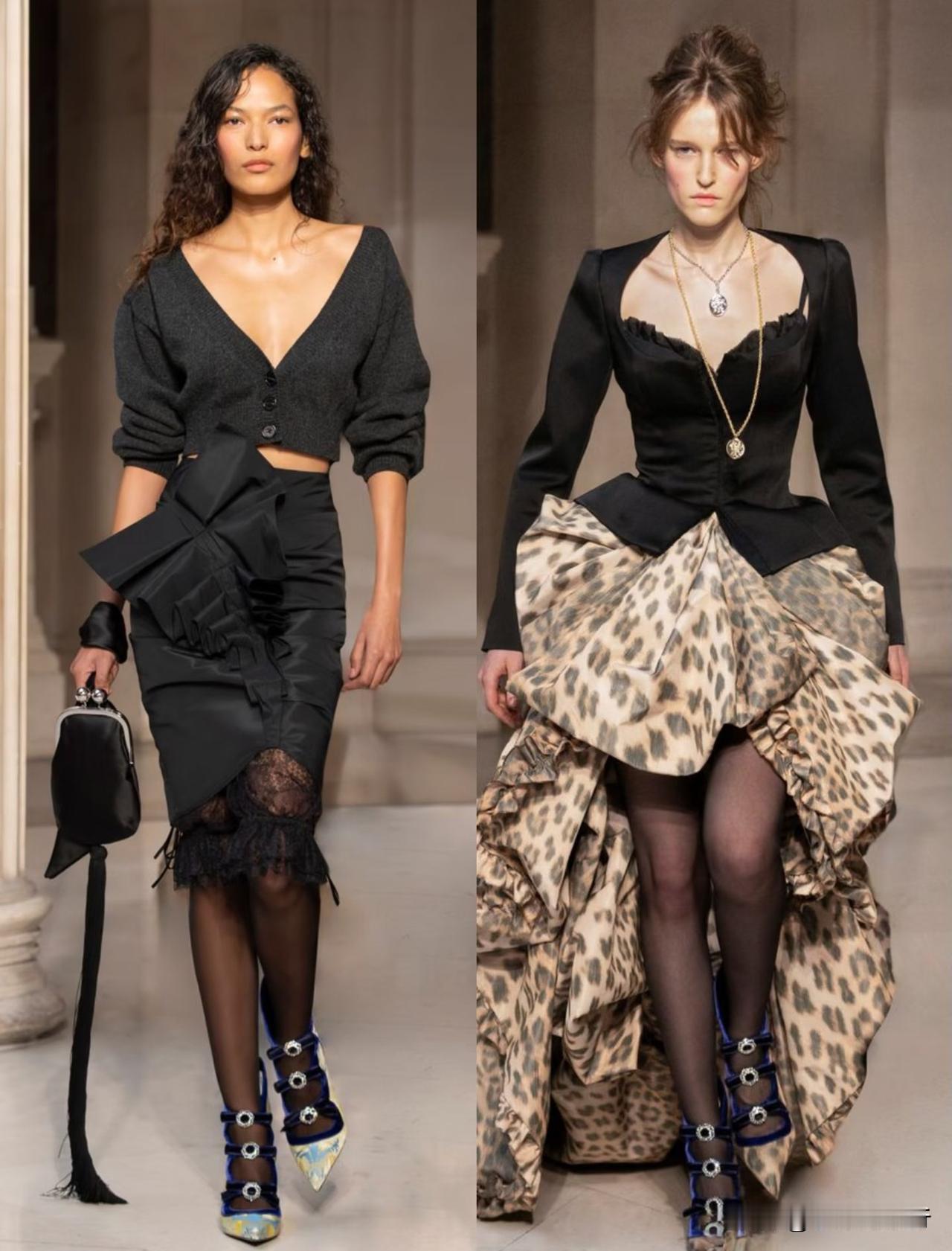 本季以华丽复古为基底,融合洛可可式精致与现代解构主义,夸张廓形、蓬松裙撑与利落肩线形成鲜明对比。面料选用丝绒、缎面与透视蕾丝,搭配暗纹刺绣与金属细节,在黑金、酒红、墨绿等浓郁色调下,尽显神秘高级感。