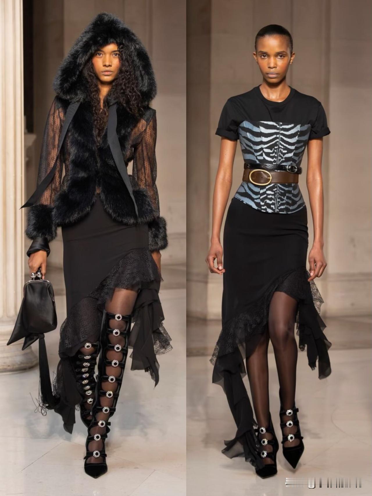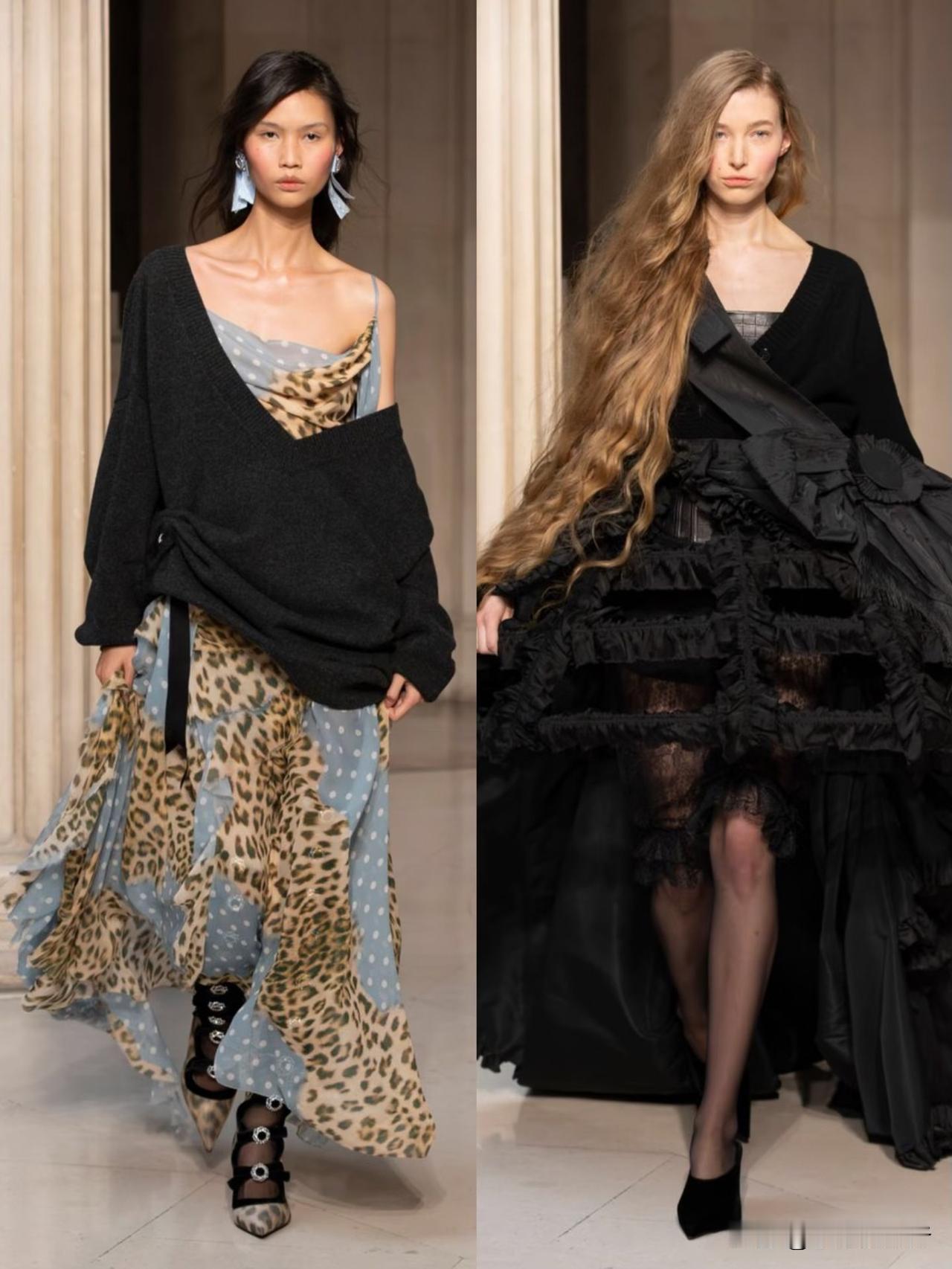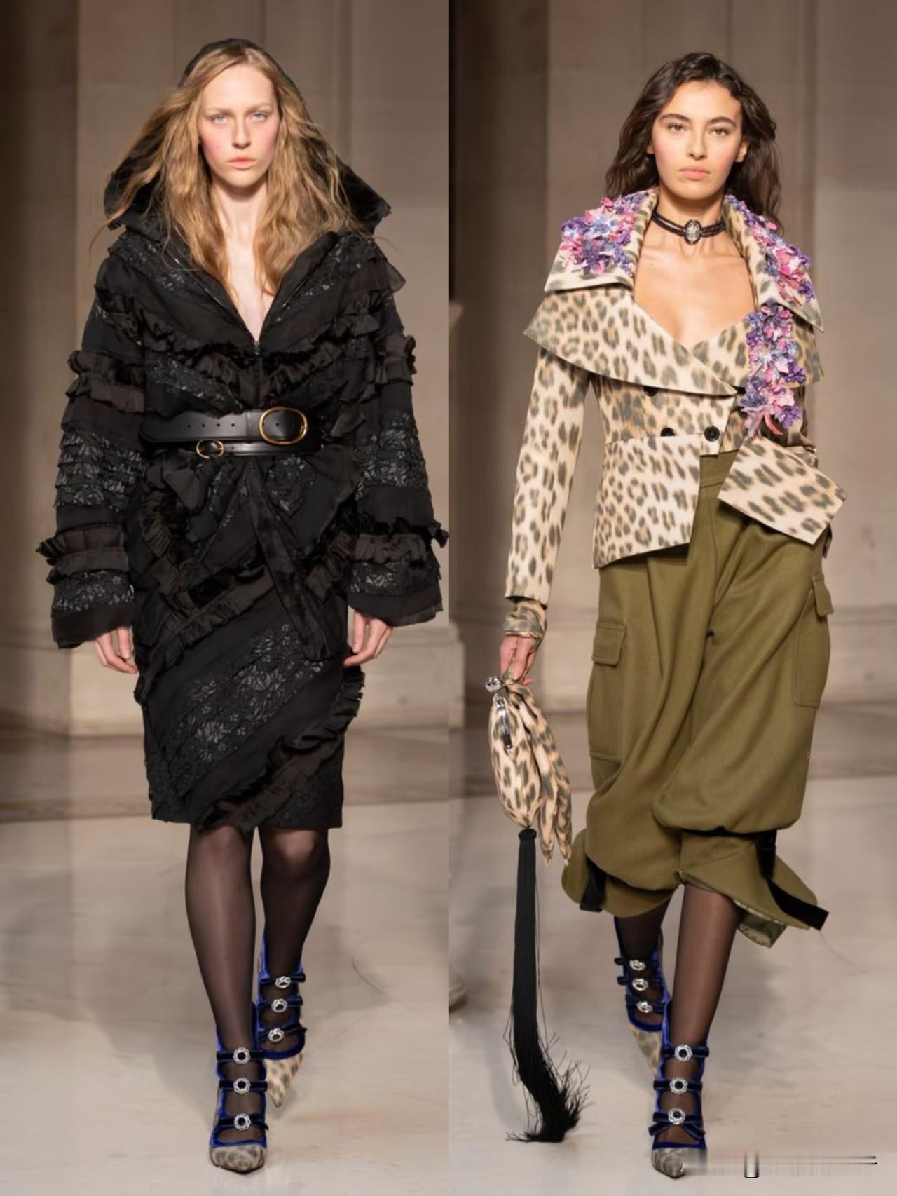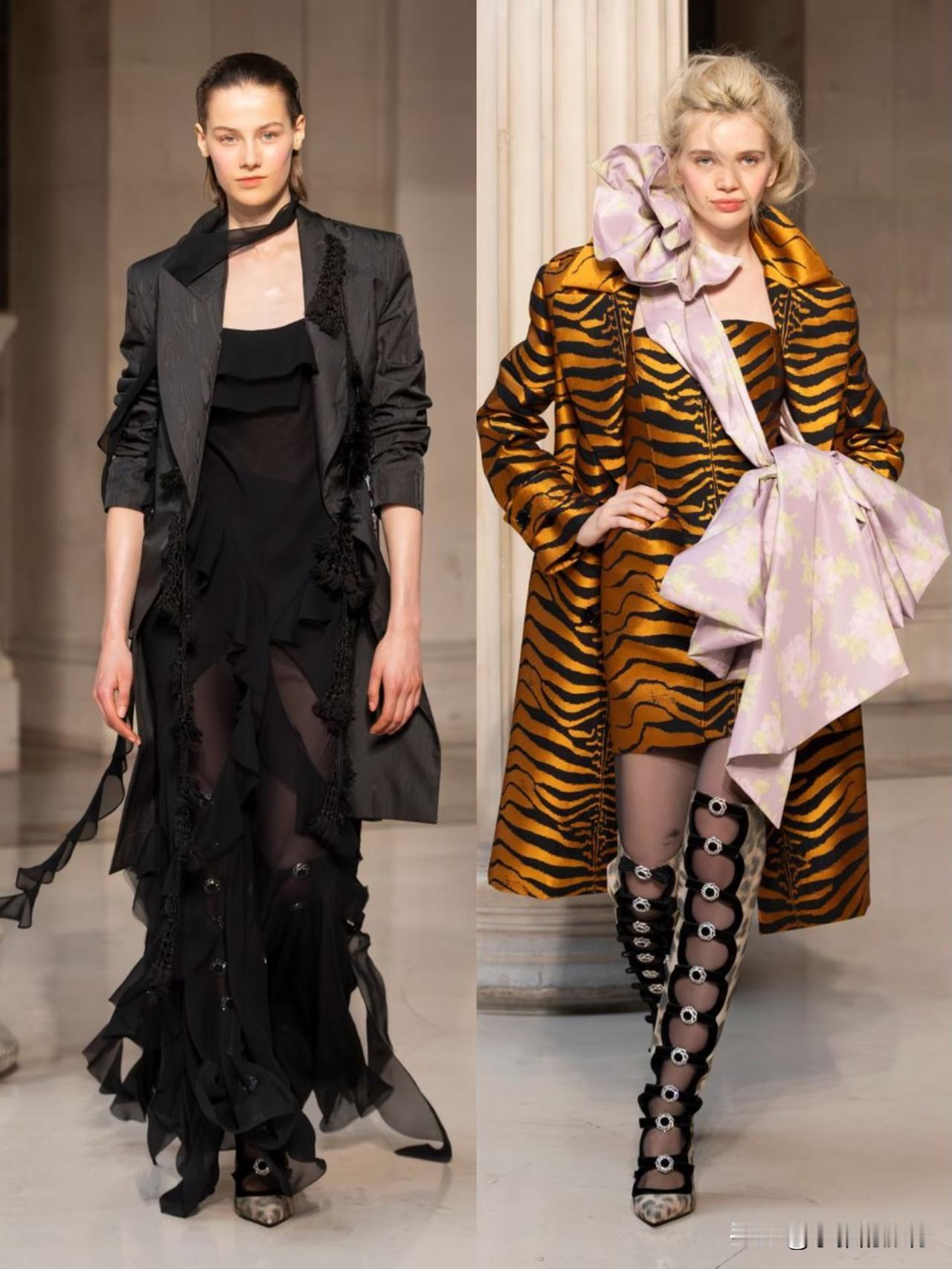 本季以华丽复古为基底,融合洛可可式精致与现代解构主义,夸张廓形、蓬松裙撑与利落肩线形成鲜明对比。面料选用丝绒、缎面与透视蕾丝,搭配暗纹刺绣与金属细节,在黑金、酒红、墨绿等浓郁色调下,尽显神秘高级感。