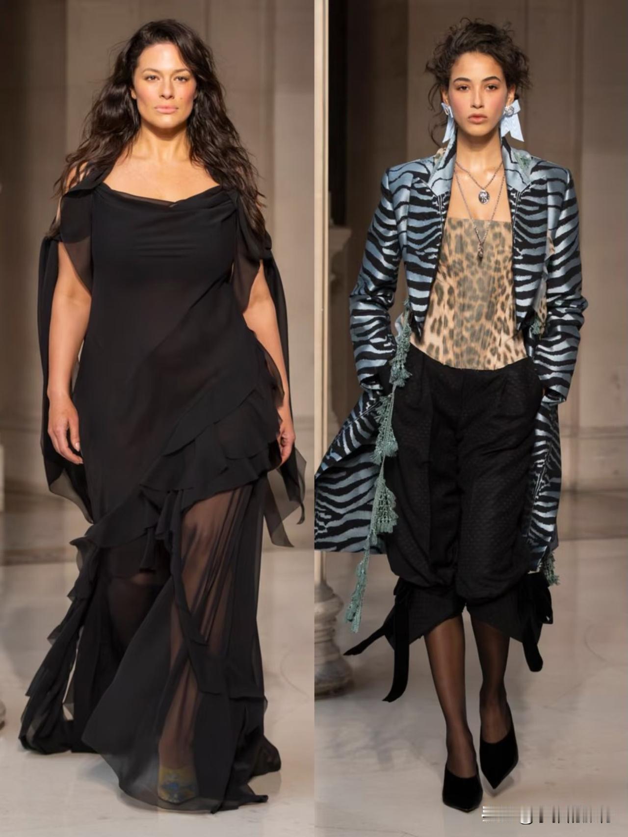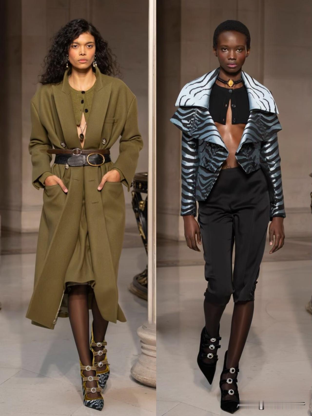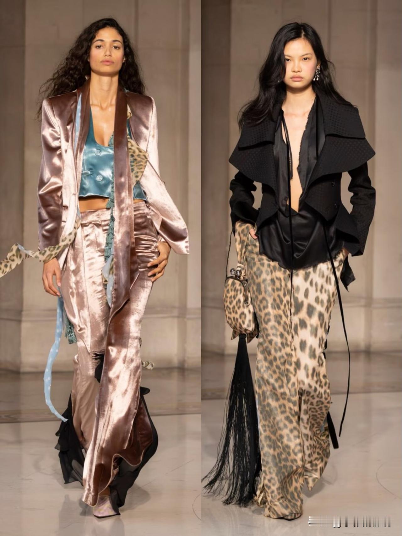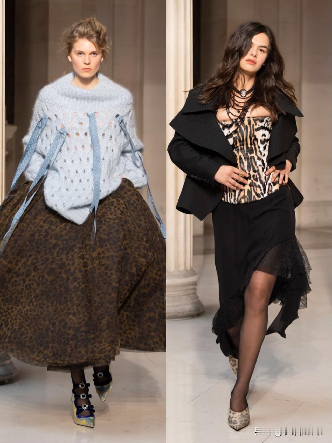 本季以华丽复古为基底,融合洛可可式精致与现代解构主义,夸张廓形、蓬松裙撑与利落肩线形成鲜明对比。面料选用丝绒、缎面与透视蕾丝,搭配暗纹刺绣与金属细节,在黑金、酒红、墨绿等浓郁色调下,尽显神秘高级感。