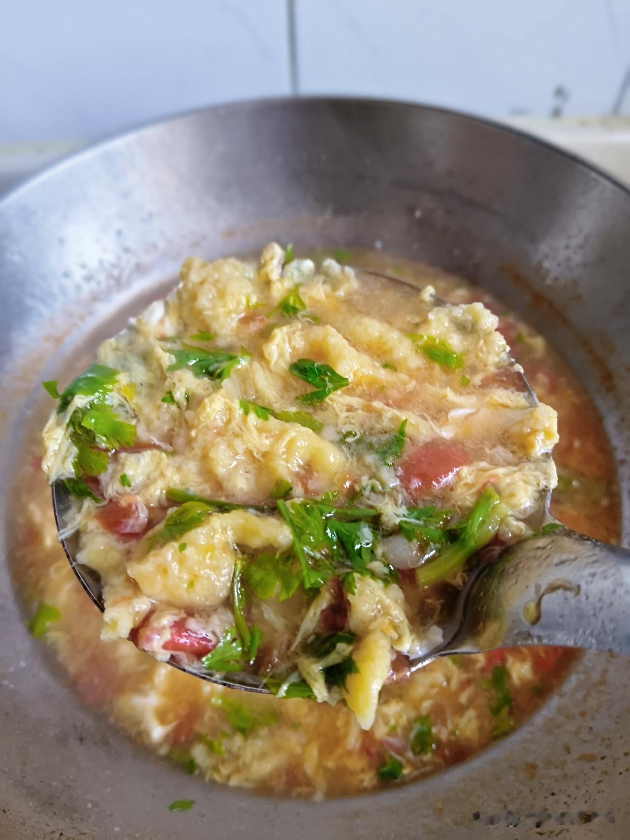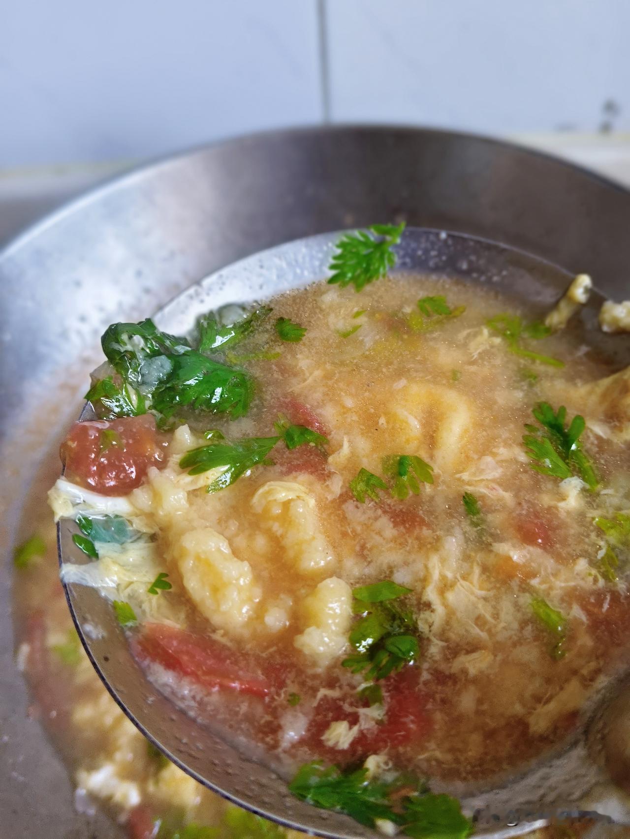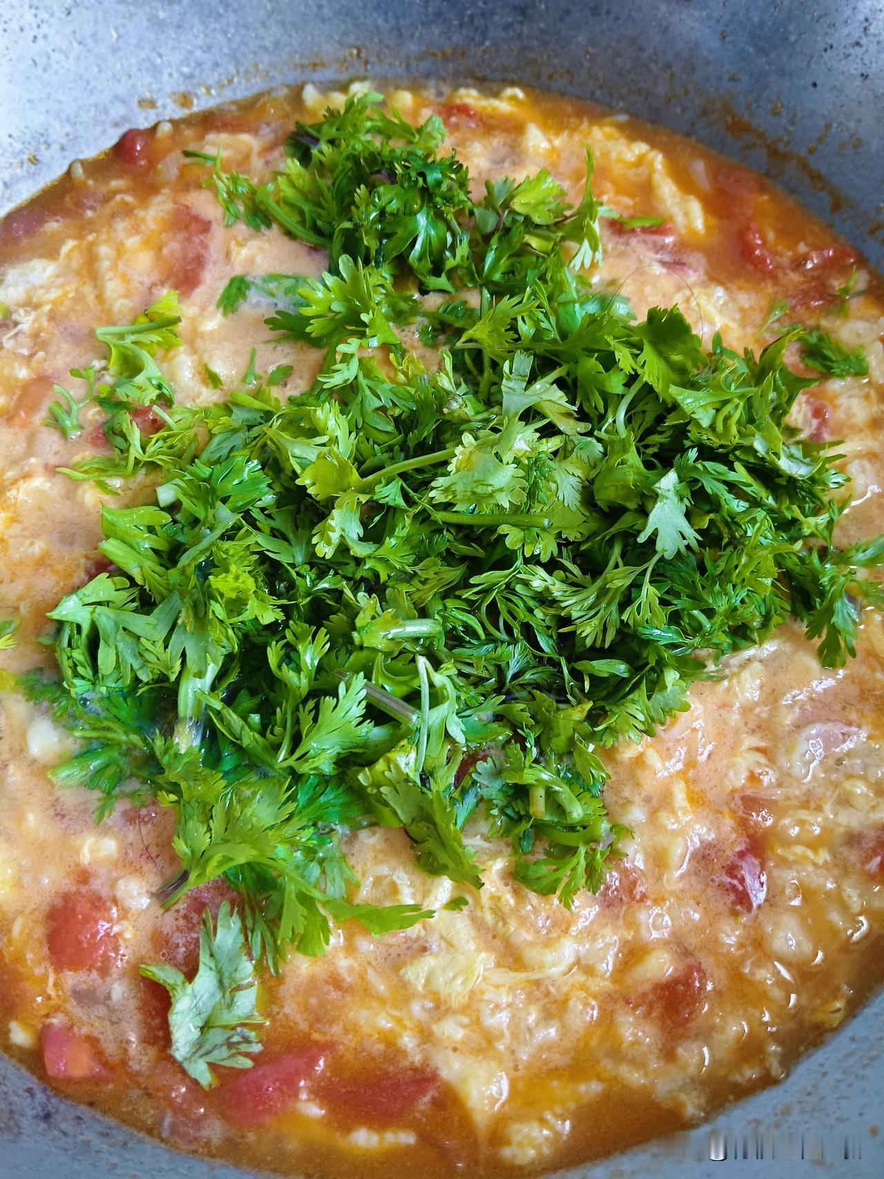 摘好香菜,西红柿切丁,来三勺面,打一个鸡蛋,搅拌成糊状,葱花炝锅,炒西红柿,出沙,加水,煮开,面糊绞进锅里,开锅,打一个鸡蛋碎儿,放香菜,胡椒面,香油。